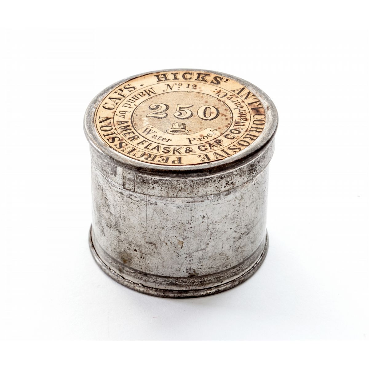 Large Cap Tin, marked ''Hicks Anti-Corrosive Percussion Caps, Manu'd by Amer. Flask & Cap, Waterbury, CT''; ''250 Count Waterproof No. 12''. Condition is excellent. Label with minor foxing, but 98% clear and legible. Solder joints are tight. Appears to be nearly full. Est.: $300-$500.