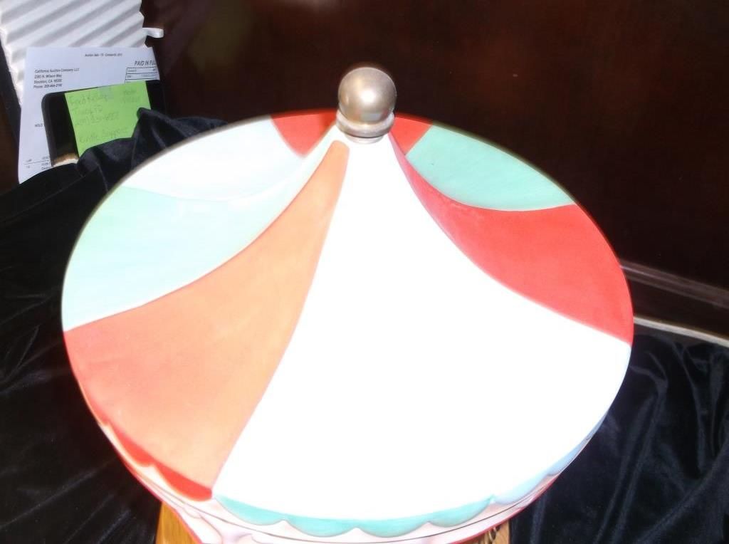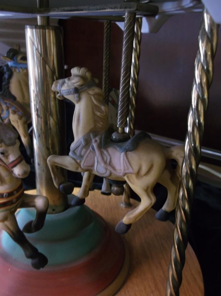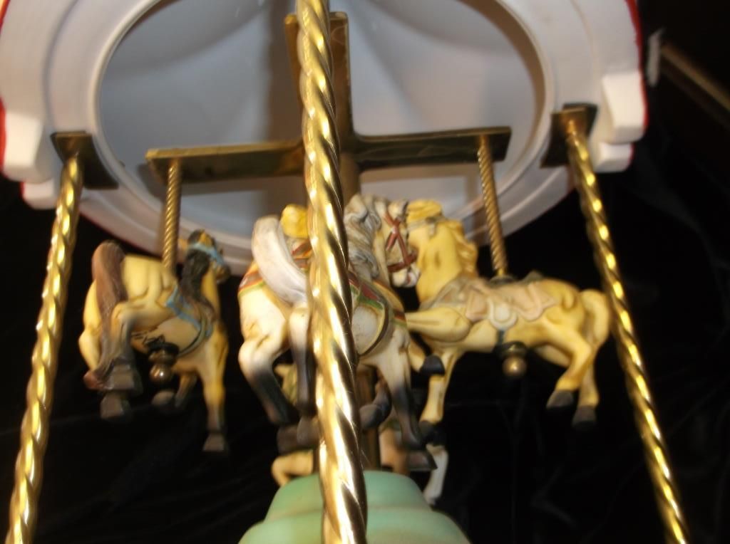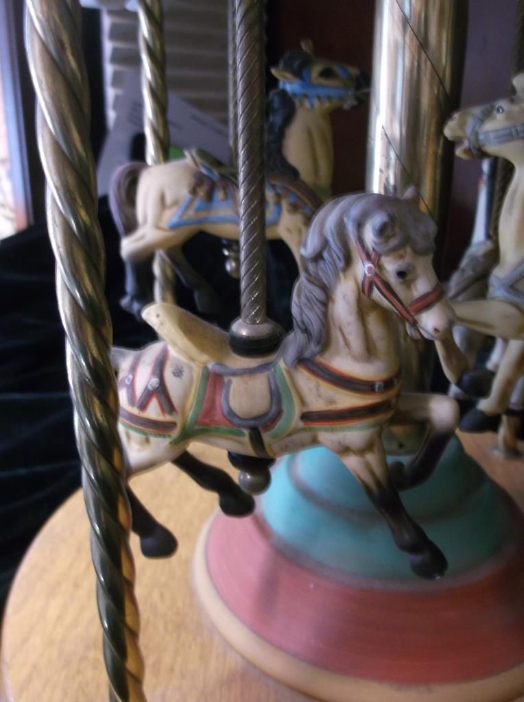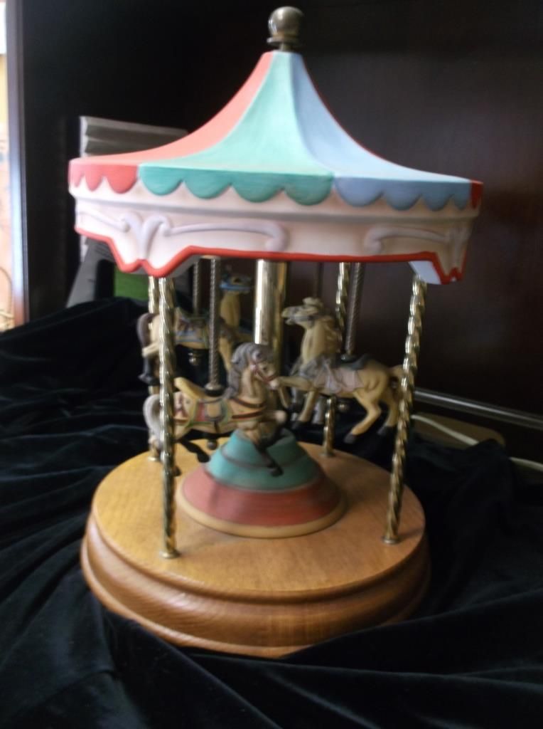 12" round by 17" tall you turn the top on carousel to wind - has 4 hand painted horses....plays Carousel Waltz condition is good....