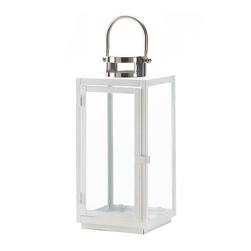 Large Carrel White Lantern **|**|** This contemporary lantern will make a bold statement indoors or out. The iron framework features fresh white paint, four clear glass panels, and a hinged door so you can easily fill it with the candle of your choice. Its topped with a silvery finial and has a stylish hanging handle.Description Details Item weight: 4 lbs.Product Dimensions: 7-1/8 x 6-3/4" x 15-1/4" high; 19" high with handle.Product Material: Iron and glass.UPC Code: 849179020620.Packaging: 1 EA"