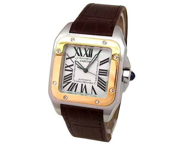 Large Cartier 18K Santos 100 Watch **|**|** Large Cartier 18K Yellow Gold & Stainless Steel Santos 100 Watch. Silver Roman Numeral Dial. 18k Yellow Gold Bezel. Two-tone Buckle. ; MSRP: $10900
