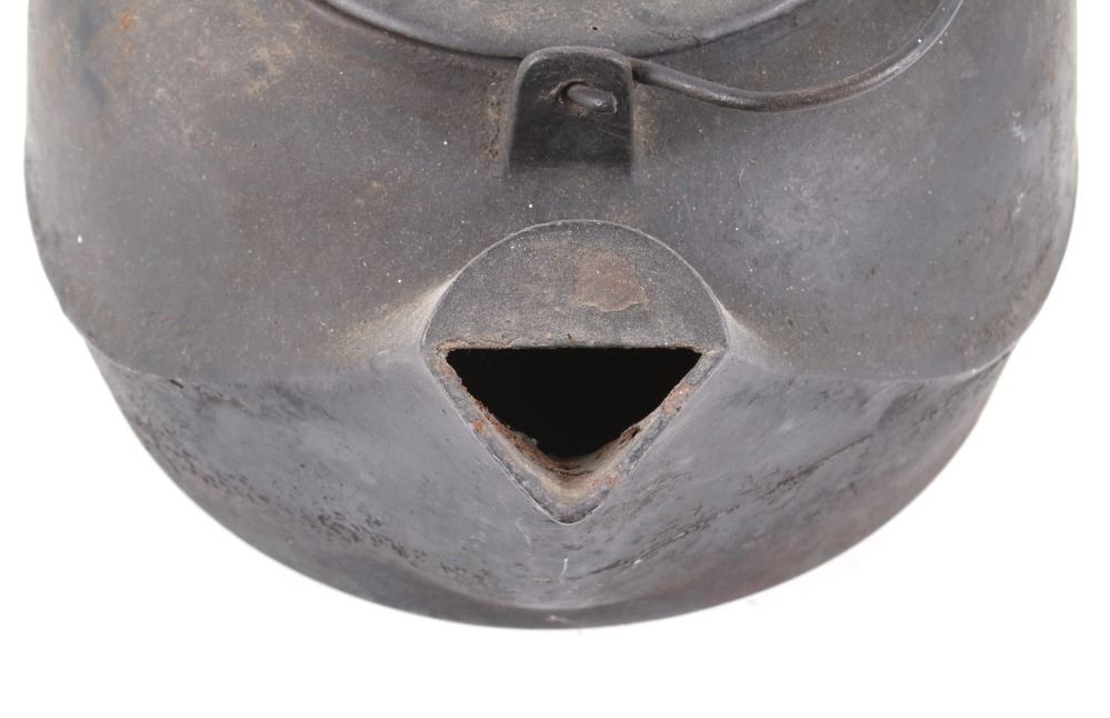 Offered in this lot we have a large cast iron water kettle and cast iron pot. The kettle displays cast iron construction with a thick triangular spout and wide base. The top of the piece shows a cast iron lid and carry handle. The pot shows cast iron construction with a deep basin and metal carry handle. The pieces show good condition overall with some wear due to age and use. The kettle measures 13" long by 9 1/2" in diameter with the pot measuring 10 1/4" in diameter by 4" tall.