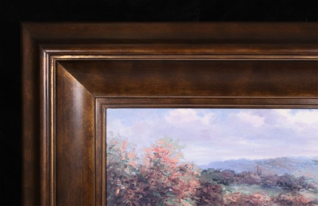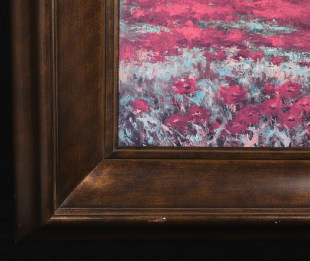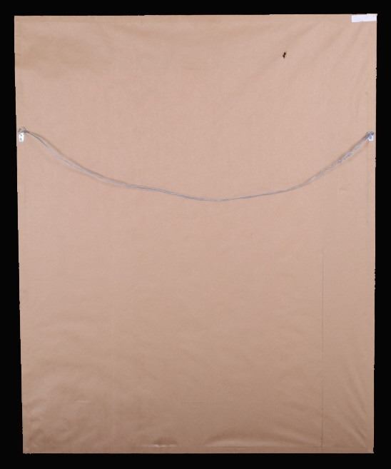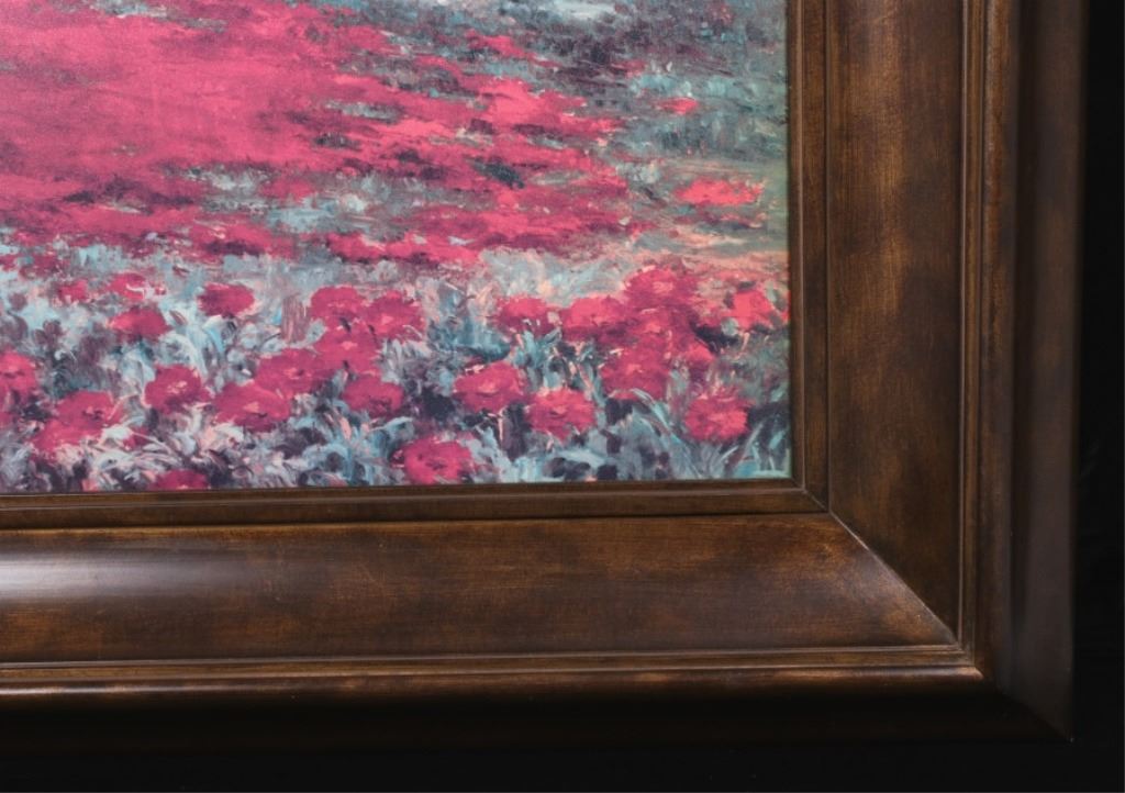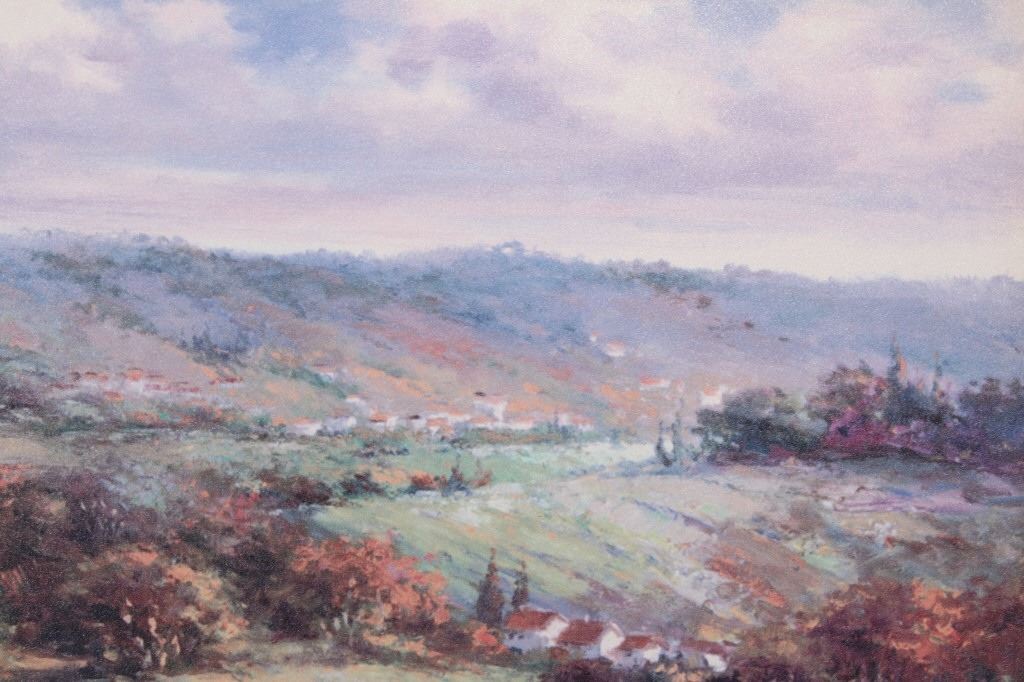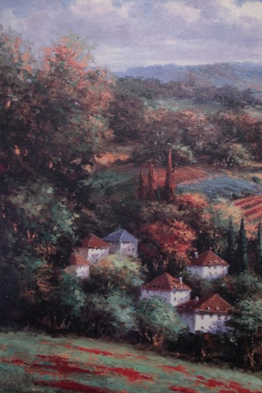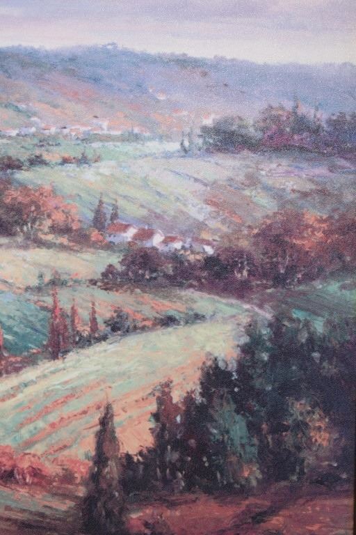 For your bidding pleasure is this Large Castellan Vineyard Landscape print by Hulguy. This large portrait is in good condition and shows great, creative artistic value. The picture was captured from the top of a hill side, looking down on a castellan compound and overlooking a large swath of land that a vineyard lays on. The frame is made of good construction, showing a healthy grain and well cared for stain. The measurements of this portrait are 64" x 51" x 4 1/2".