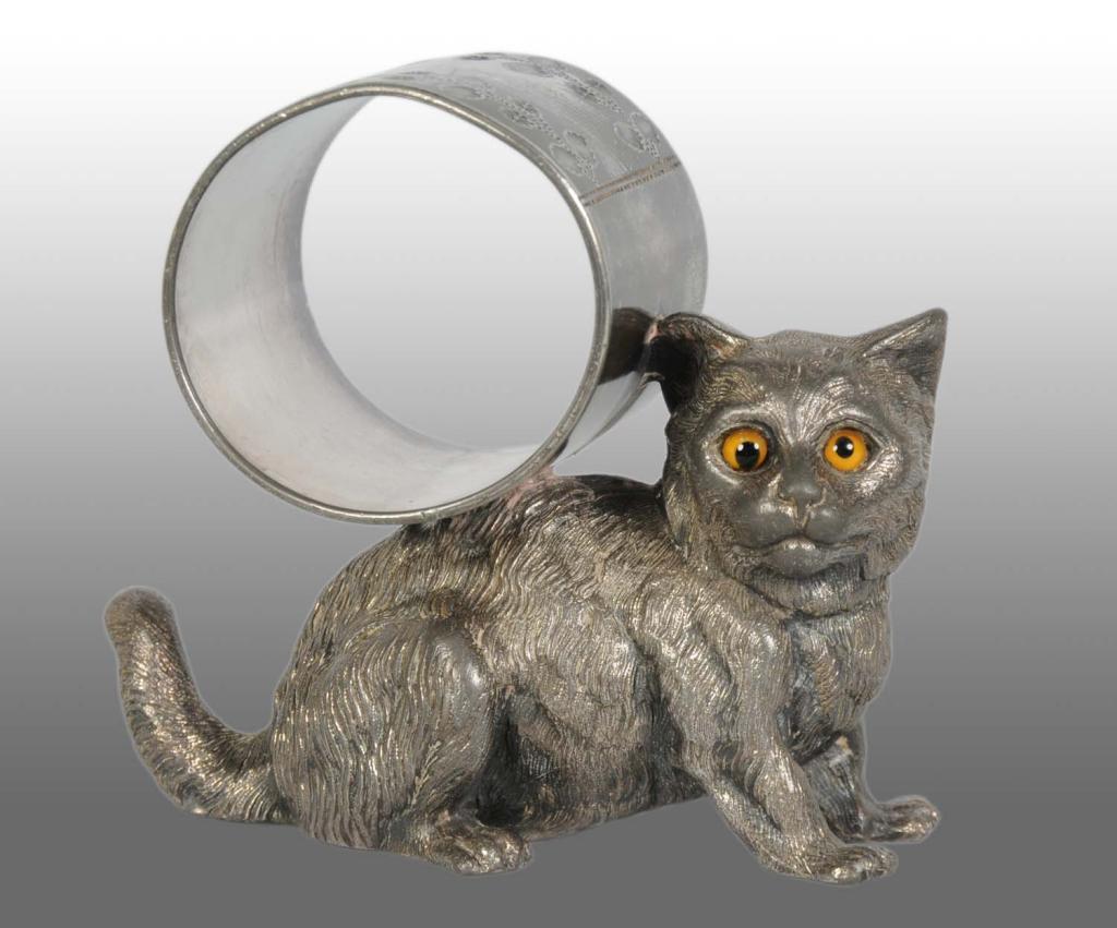 Marked "Meriden Britannia Co." and numbered "235". Depicts cat with napkin holder on back. This piece is a very sought after ring as it is pictured on the cover of "Figural Napkin Rings". Some silver loss. Condition (Excellent).