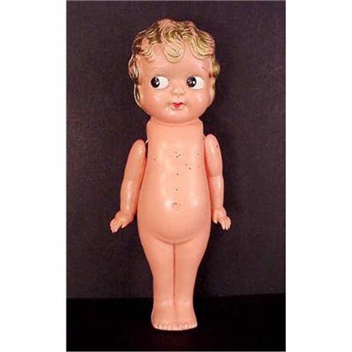 <table width="100%" border="0" cellspacing="0" cellpadding="4"><tr><td><em> </em></td></tr><tr> <td width="100%"> Wonderful LARGE CELLULOID KEWPIE like doll! This is such a cute doll! She stands 9 1/2 inches high, has gold colored molded hair. Adorable googly like eyes and the famous big tummy. The condition is very nice, no dents or breaks, has tiny pierce markings on front chest & back, I'm not sure if it was meant as a rattle. The arms need to be tightened; the original string is loose. The doll is marked with an embossed Made in Japan and has an interesting logo above it. This is a lovely addition to one's CELLULOID collection! We are always happy to combine shipping to save the customer on shipping costs. </td></tr><tr> <td> </td></tr><tr> <td>Reference #: 2147</td></tr><tr><td>Condition:Very Nice</td></tr><tr><td>Year:1920s-30s</td></tr><tr><td>Title:Large Celluloid Kewpie Doll Googly Eyes</td></tr><tr><td>Location:WA</td></tr></table>
