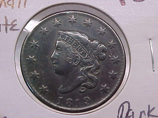 Large Cent 1819 small date AU, dark brown/steel color