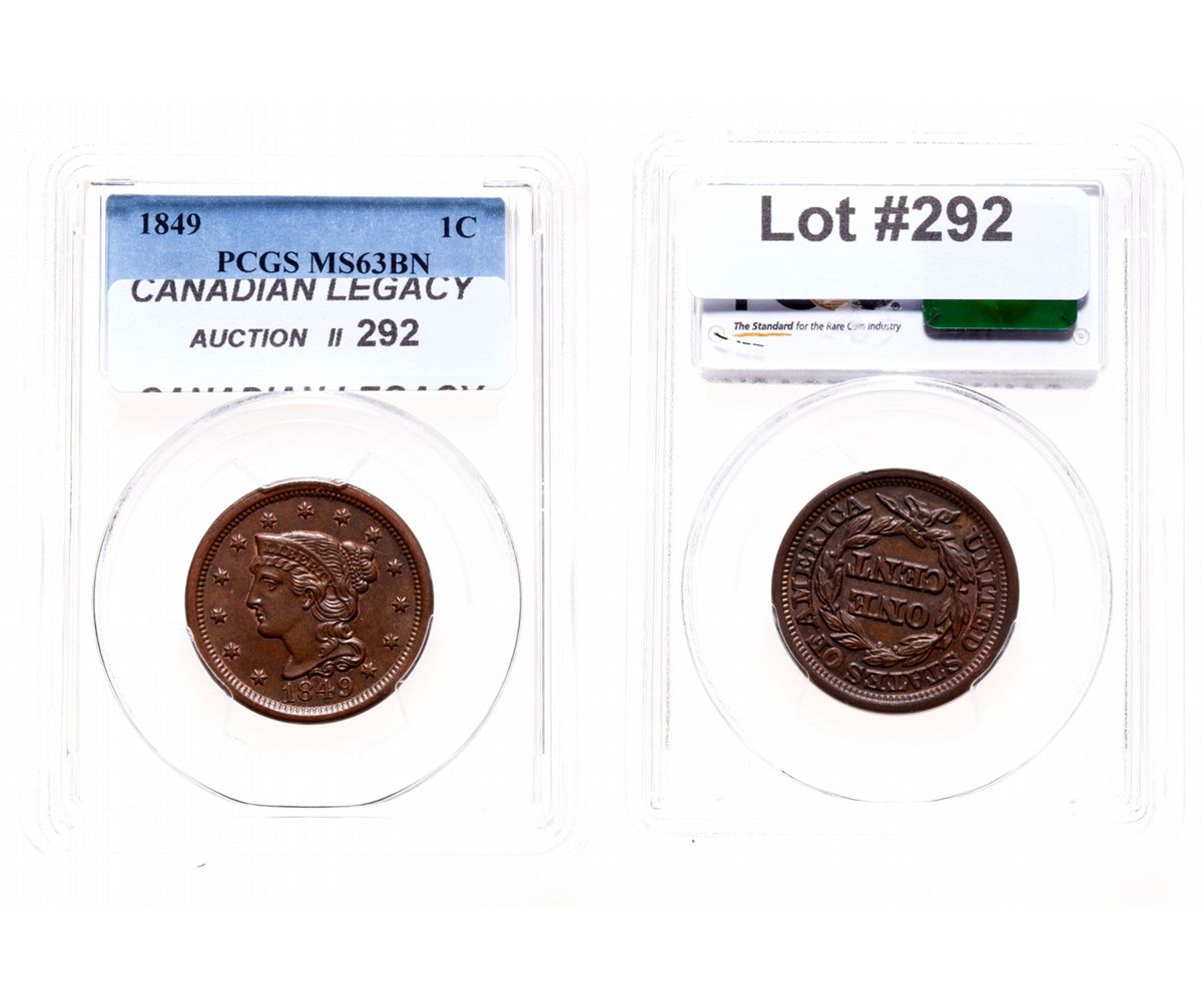 Large Cent. 1849. PCGS graded Mint State-63. Brown.