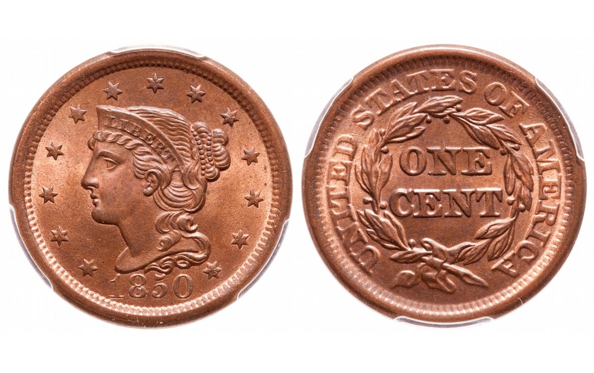Large Cent. 1850. PCGS graded Mint State-65, Red-Brown. 50% red luster.