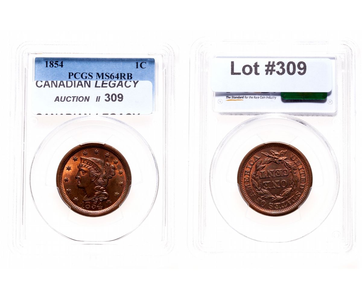 Large Cent. 1854. PCGS graded Mint State-64, Red-Brown. 35% red luster.