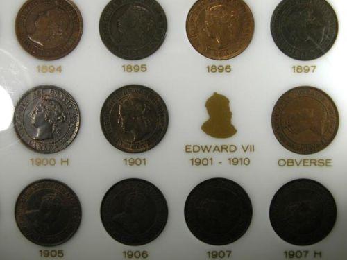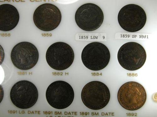 Canada Large Cent Collection 1858 to 1920 in a Capital Holder. The 1858, 1859 Double Punched #1, 1859 Wide 9 Over 8 and 1891 Small Date Small Leaves are EF or better, the 1859 Double Punched #2 is VF, the 1891 Small Date Large Leaves is VG-F. There are AU and better examples among each of the Victoria, Edward and George pieces. A well above average circulated set of fifty one pieces