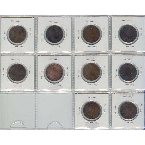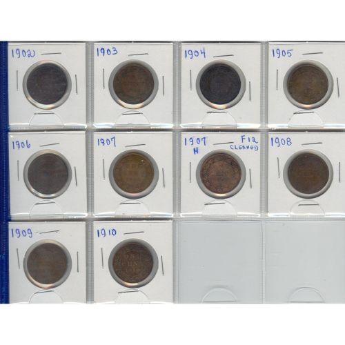 Large Cent Collection of 10 Edward VII; 1902 EF, 1903 VF+, 1904 F+, 1905 VG, 1906 EF, 1907 F Scratch, 1907H F Cleaned, 1908 VG, 1909 F+ & 1910 EF. To be viewed, sold as is no return.