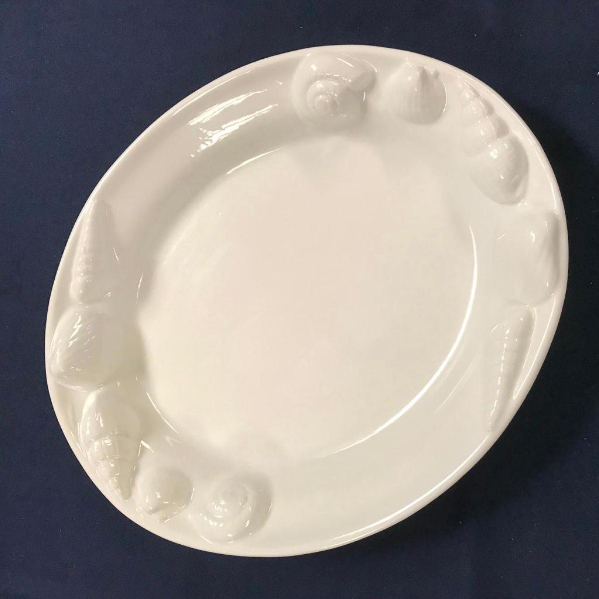 Large size, white Cordon Blue ceramic cookware, with raised shell design, seafood serving platter, for shrimp, lowcountry boil, oysters etc.. Cordon Bleu stamp on bottom. Microwave & oven safe cookware, serving dish. Previously used as display, in new, unused condition. 14" L X 11 1/2" W X 2" H.