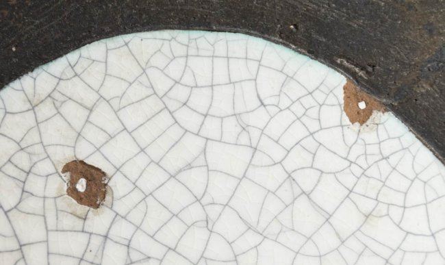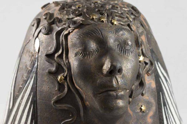 Enamel work. Signed illegibly underneath. Art Nouveau style. Approx. 25" H x 14" W. Wear to enamel.