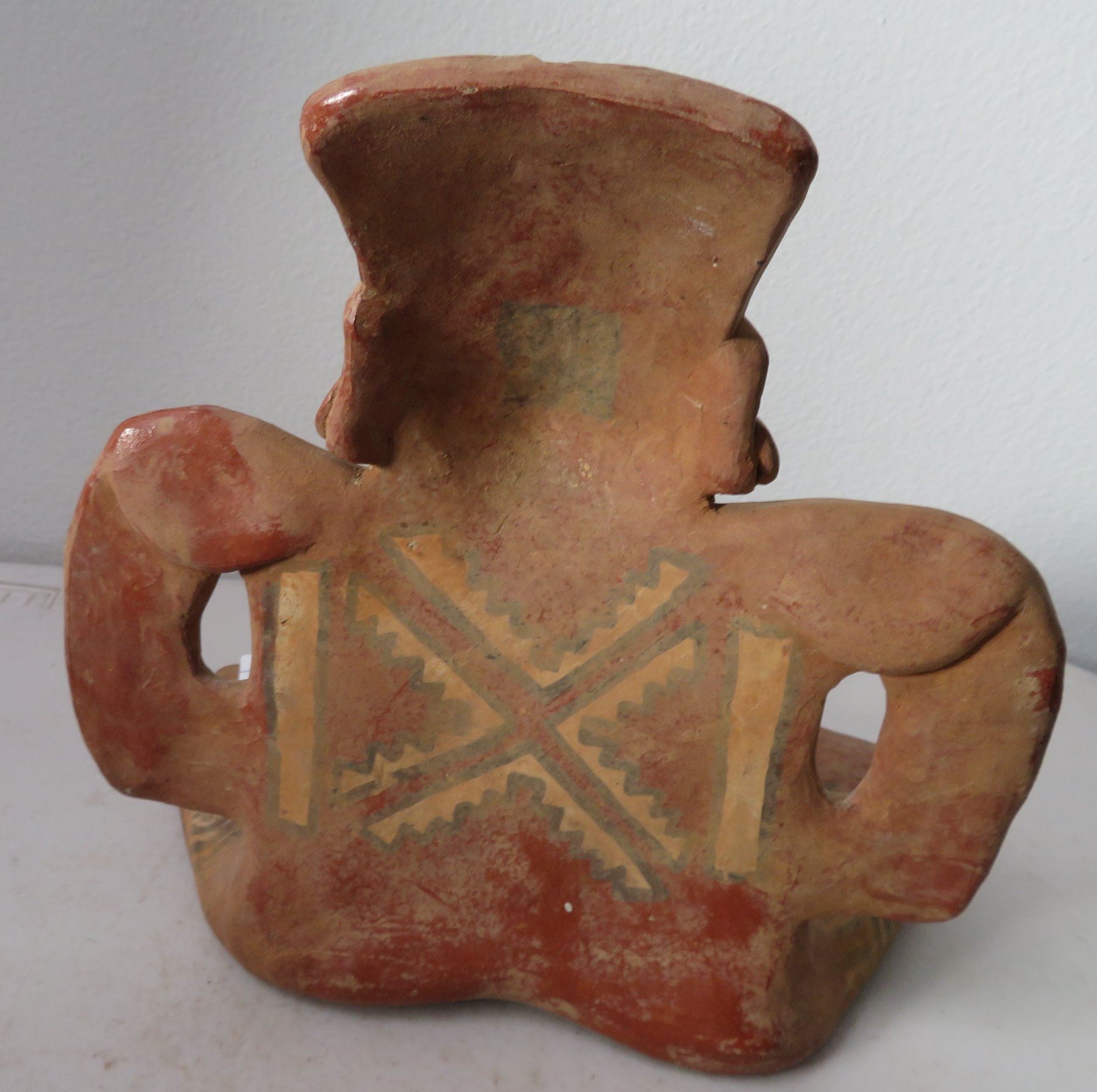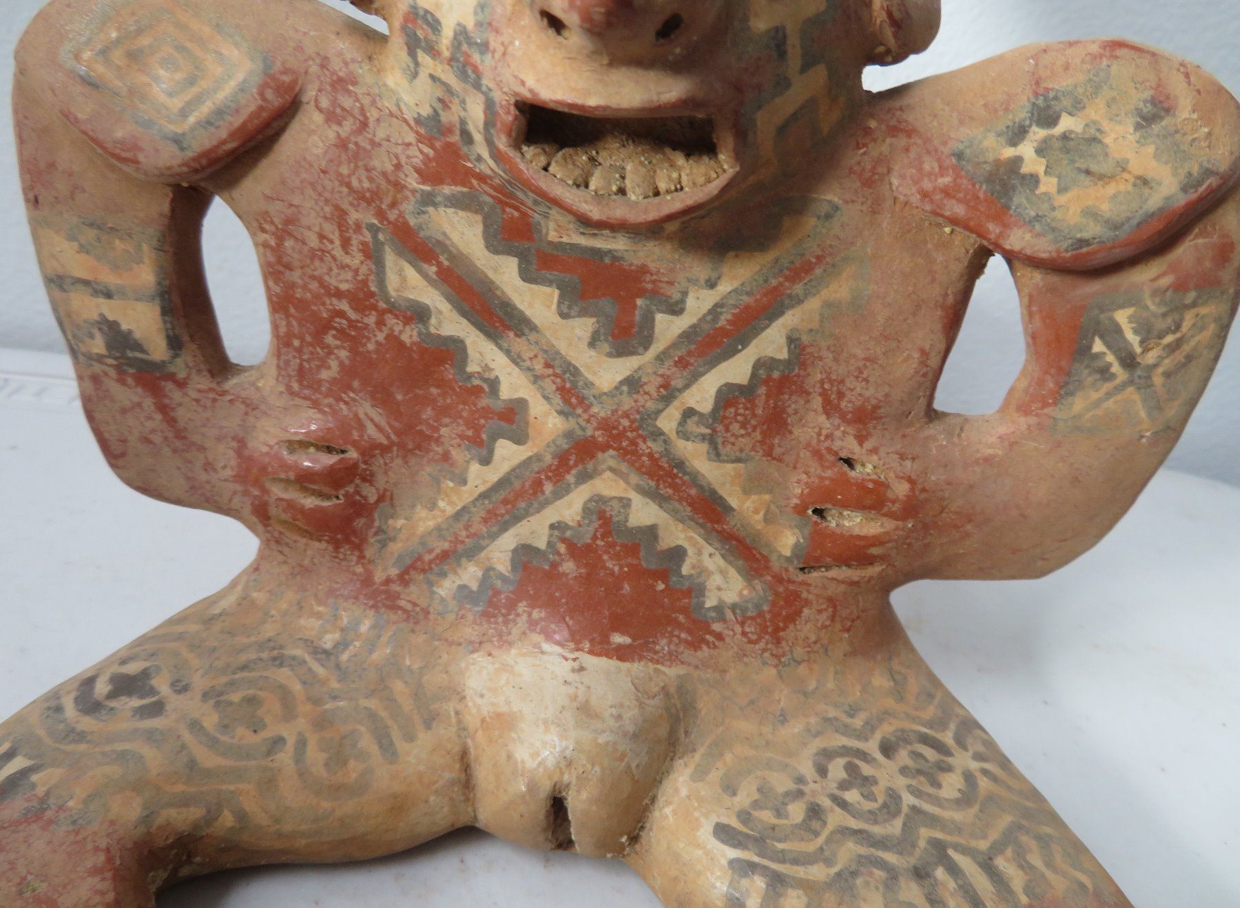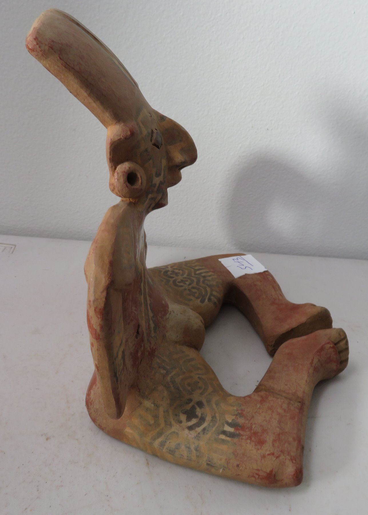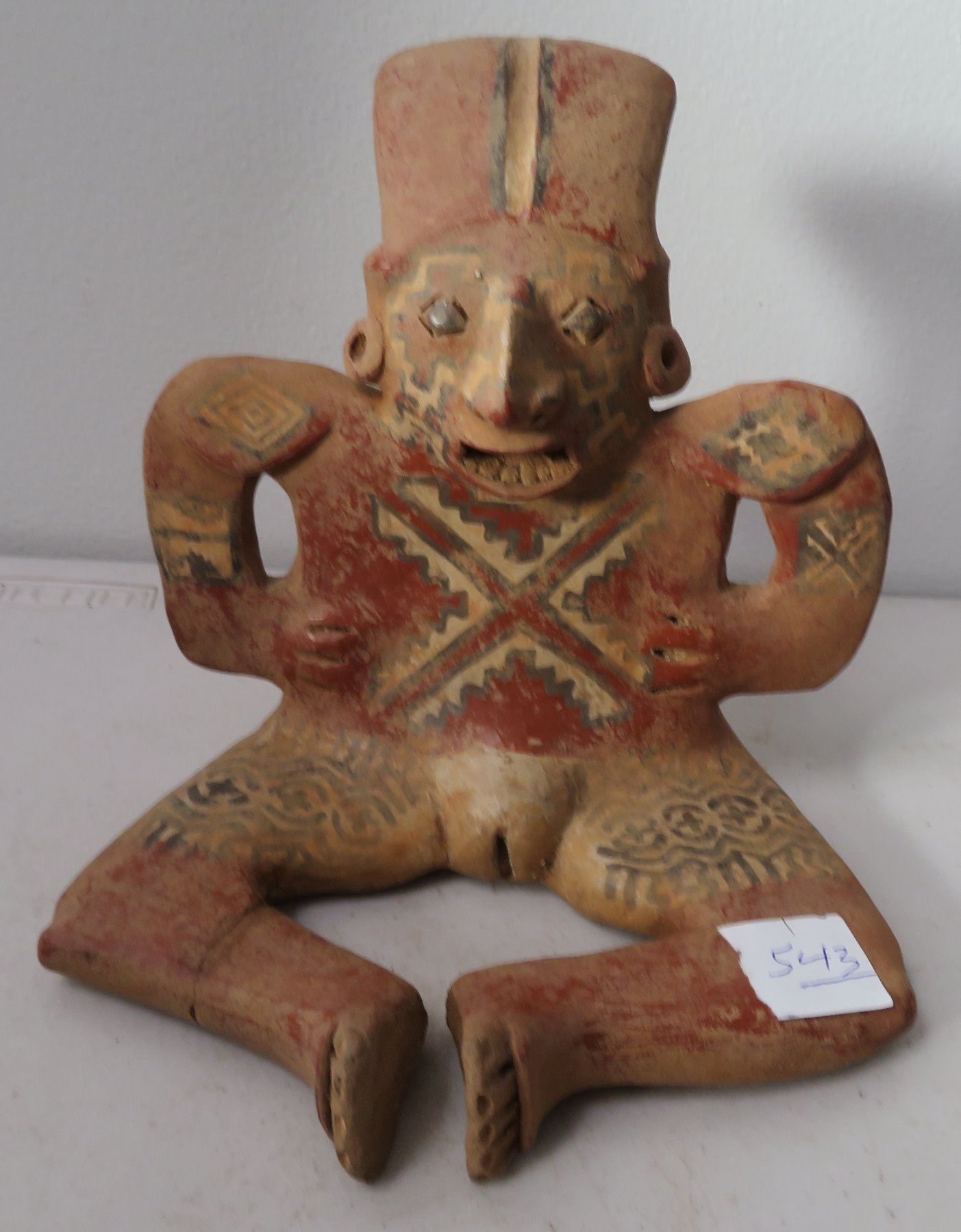 Large Ceramic Human Figure, pre-Columbian-style. Made of clay and paint, the item measures 7" x 7" x 7". Signed C. Vazquez, 91. Condition: Good, nice paint, see images. Shipping: $35.00 w/insurance and signature, double-boxed.