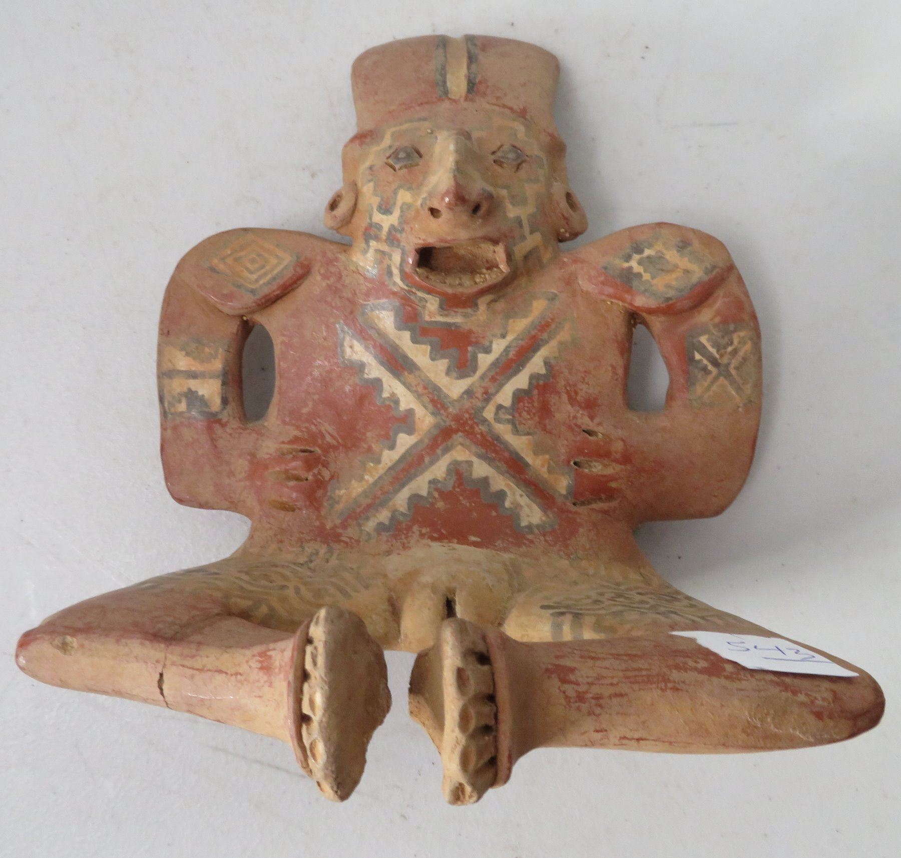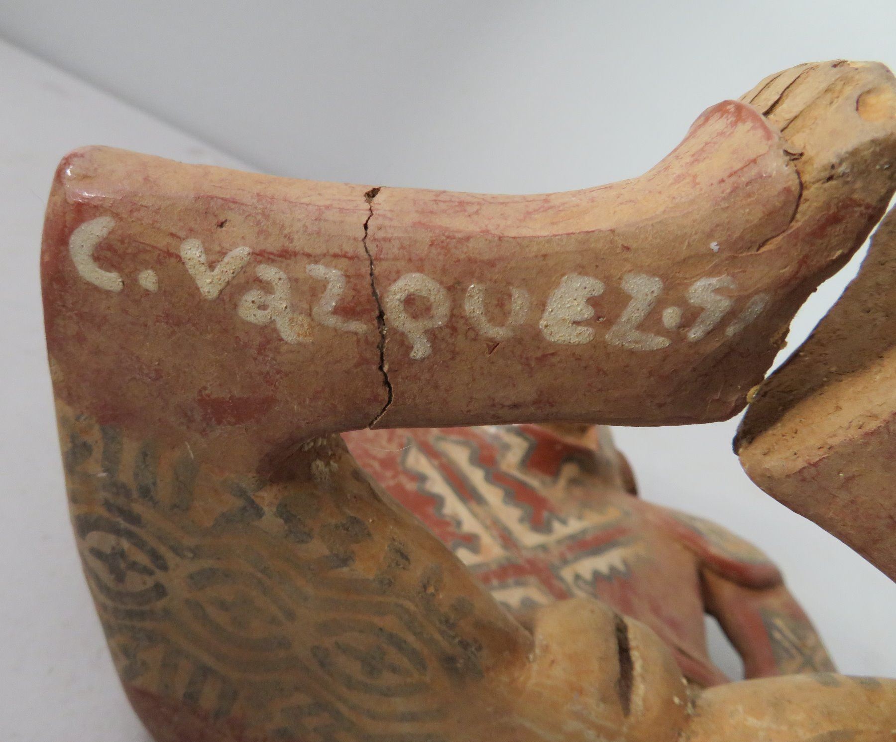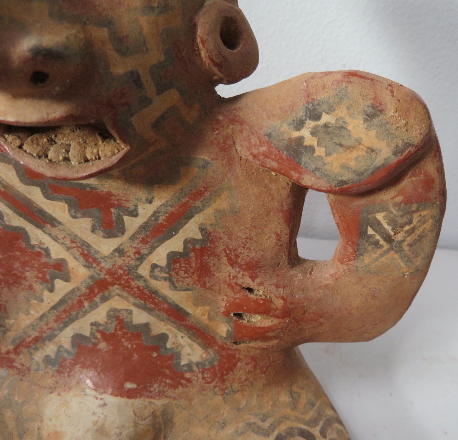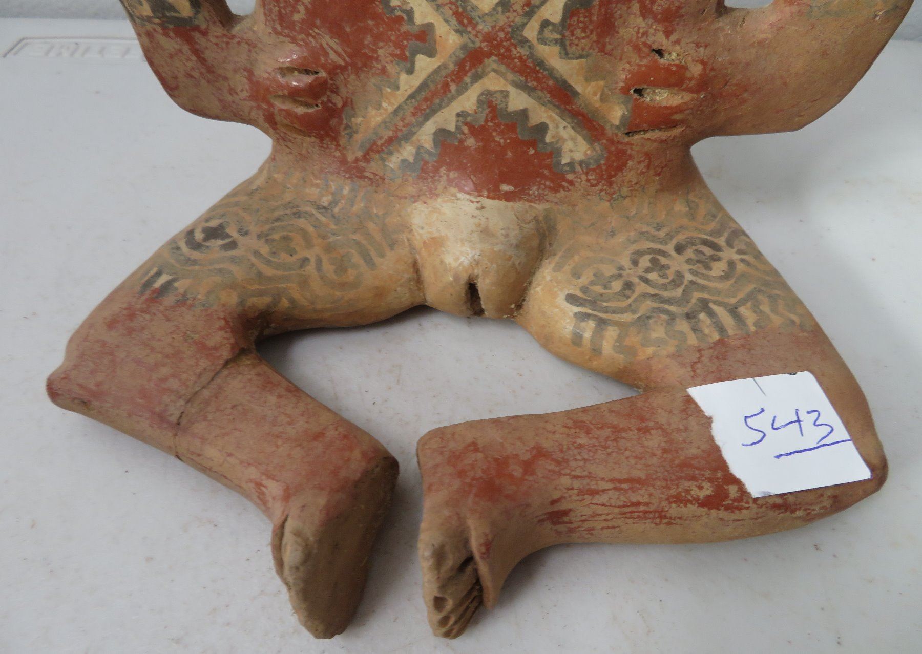 Large Ceramic Human Figure, pre-Columbian-style. Made of clay and paint, the item measures 7" x 7" x 7". Signed C. Vazquez, 91. Condition: Good, nice paint, see images. Shipping: $35.00 w/insurance and signature, double-boxed.
