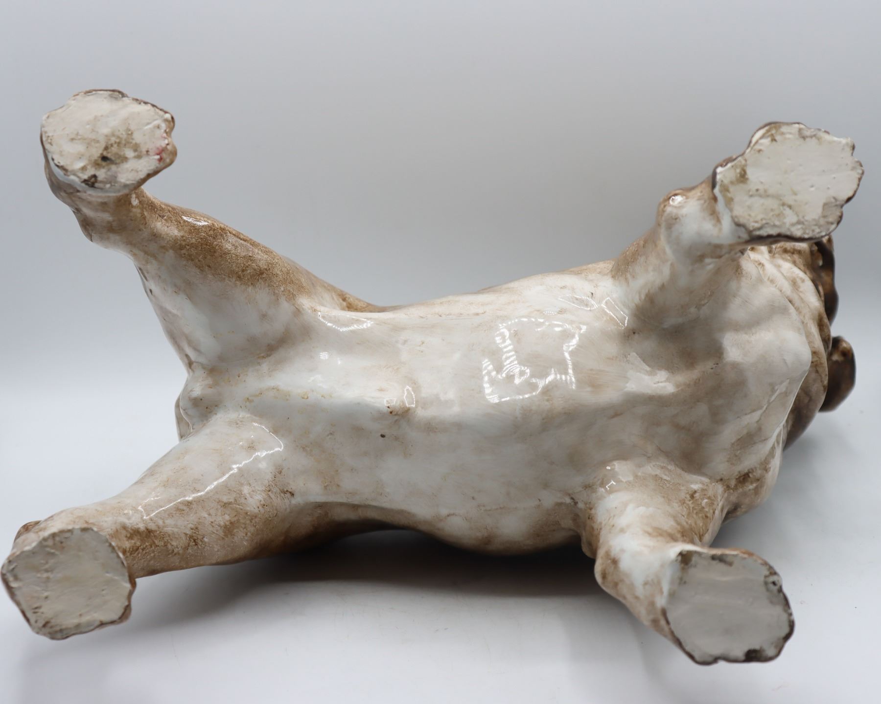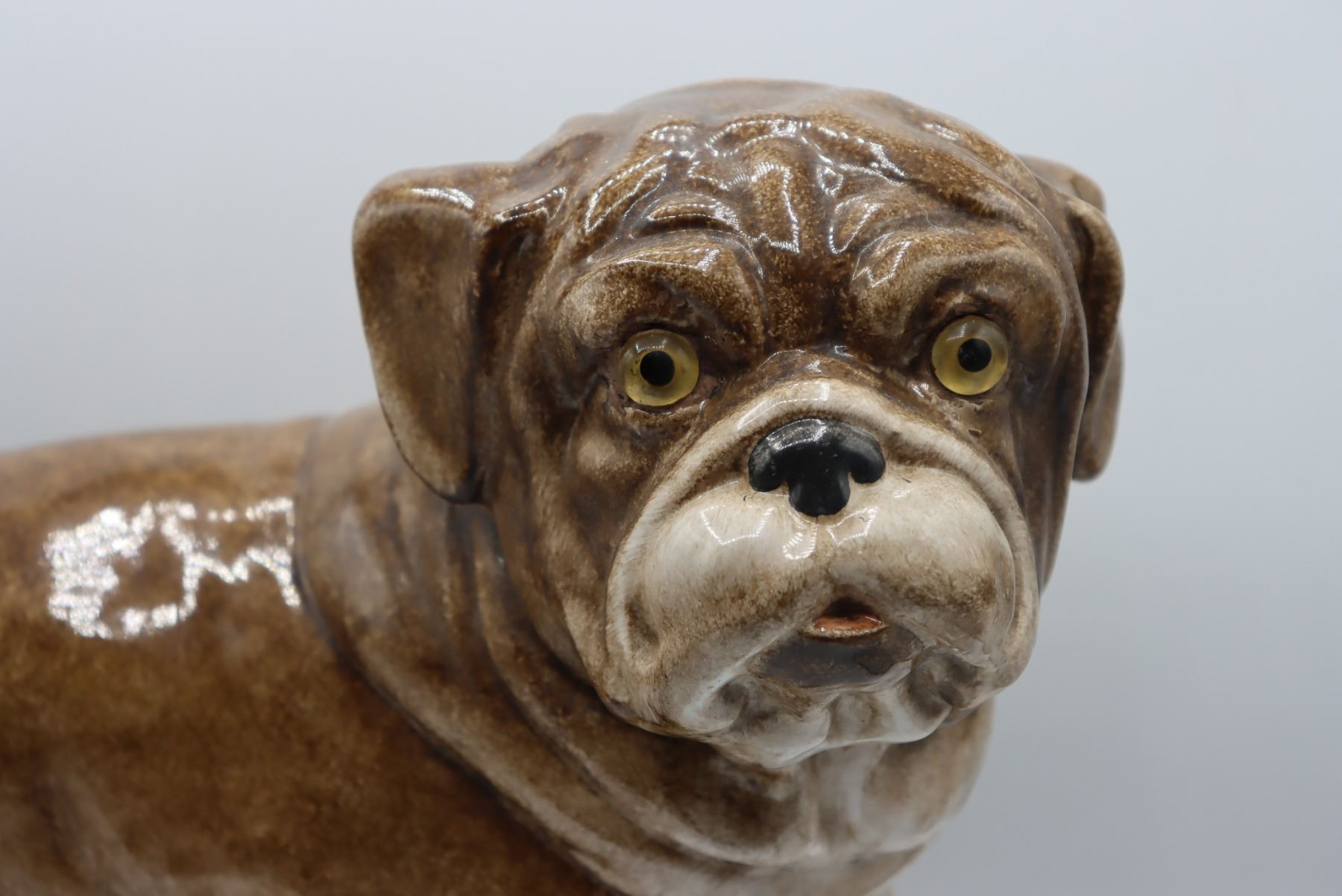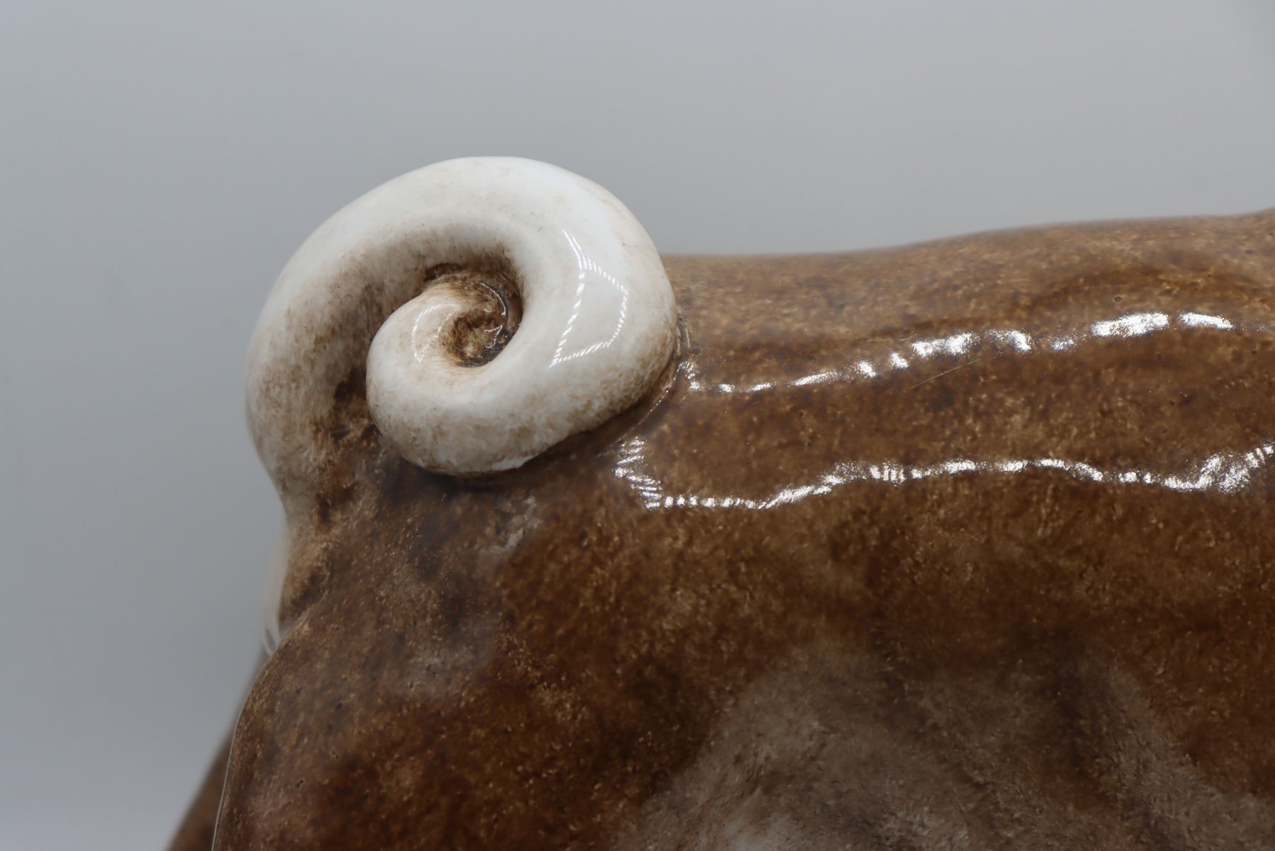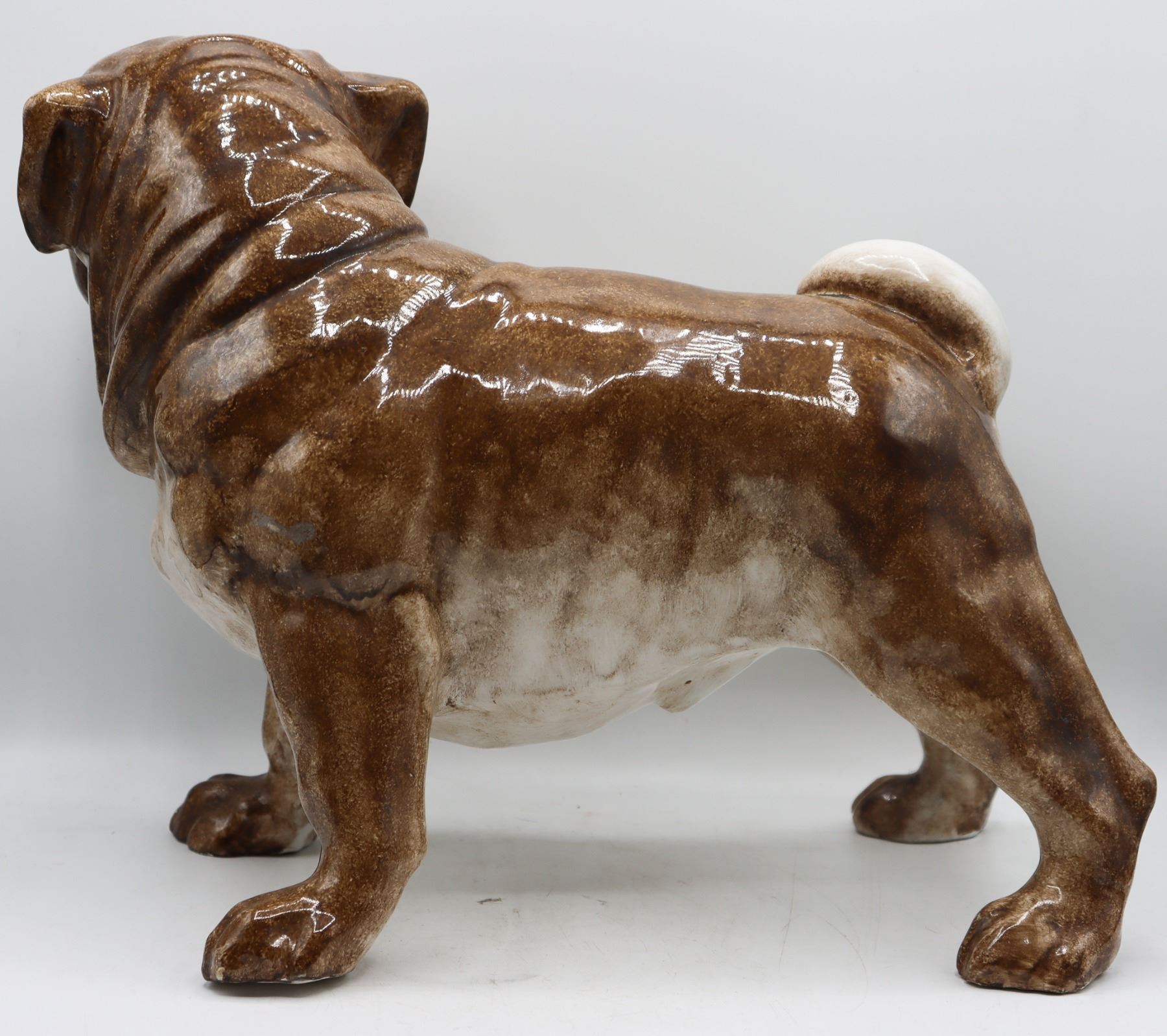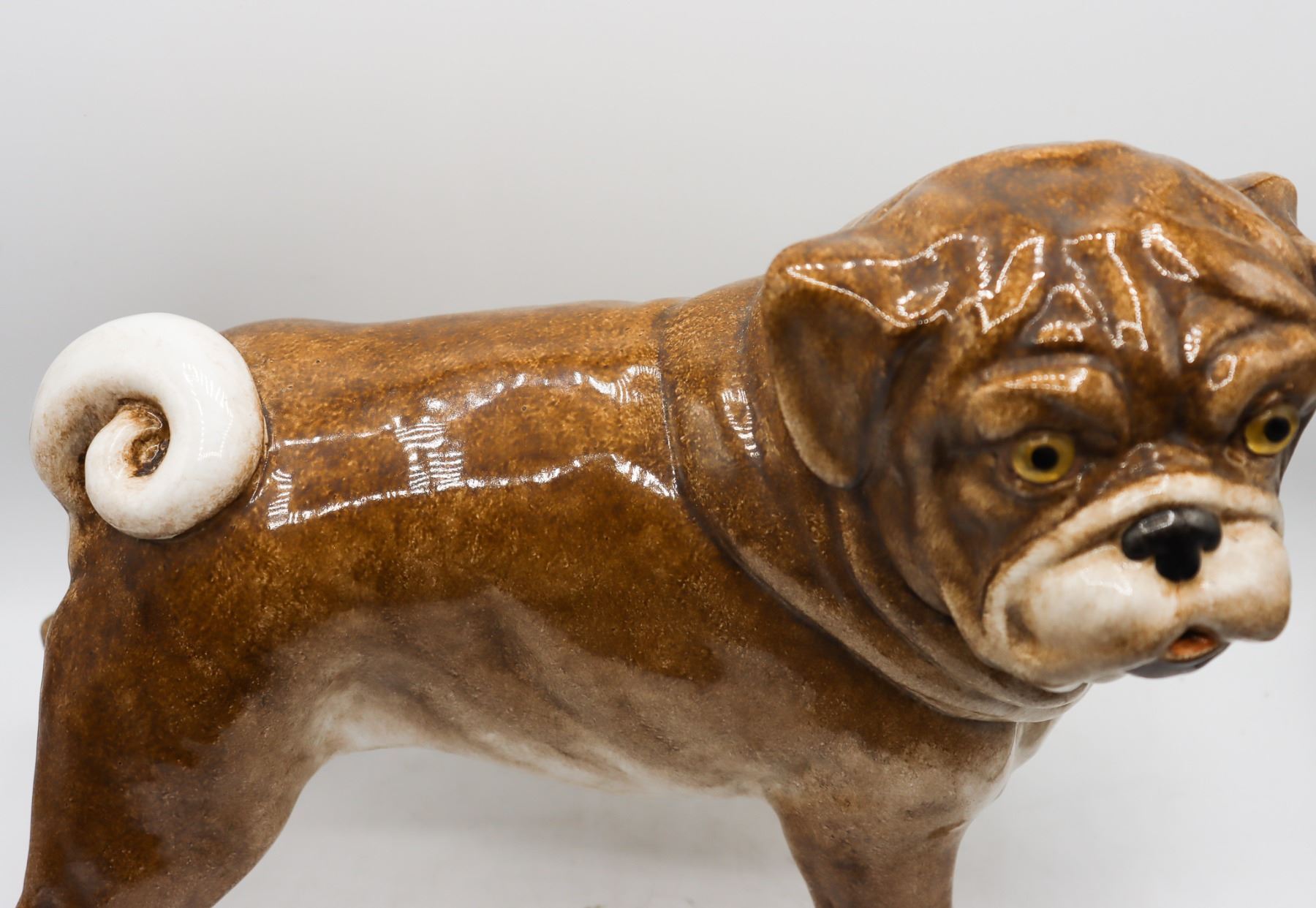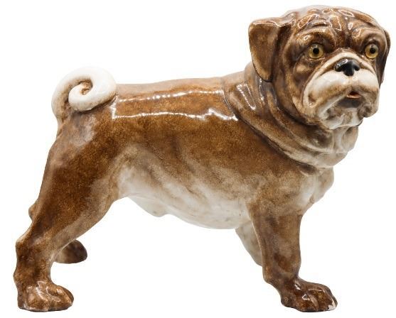 Italian ceramic pug painted finish. In the upright standing position with alert eyes. Size: 10 1/2 x 15 x 8 in.