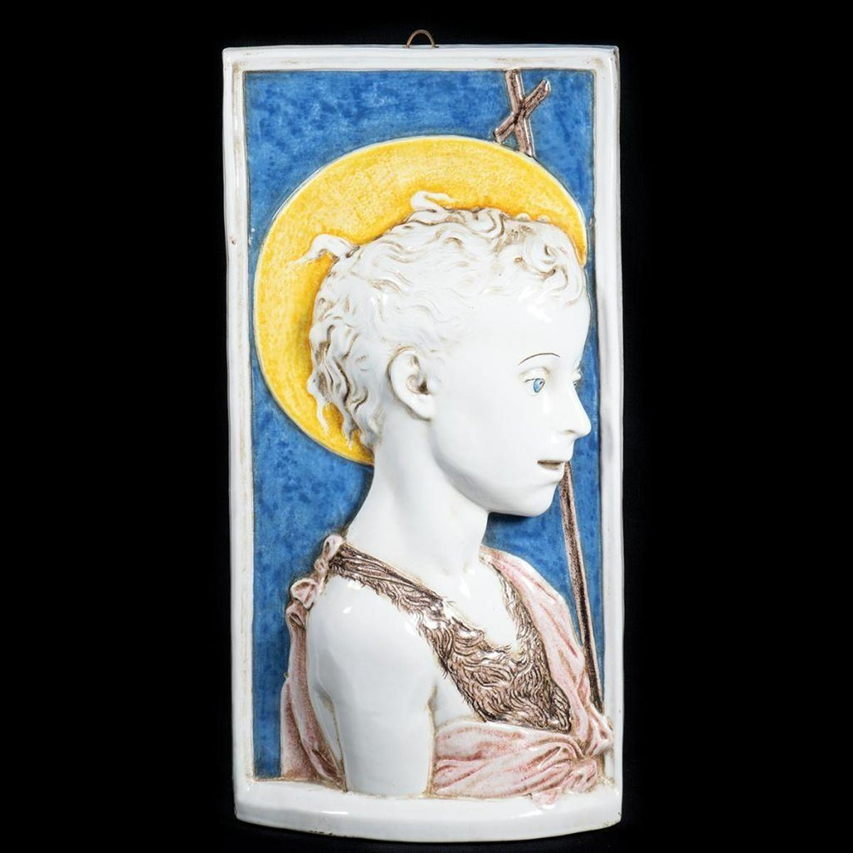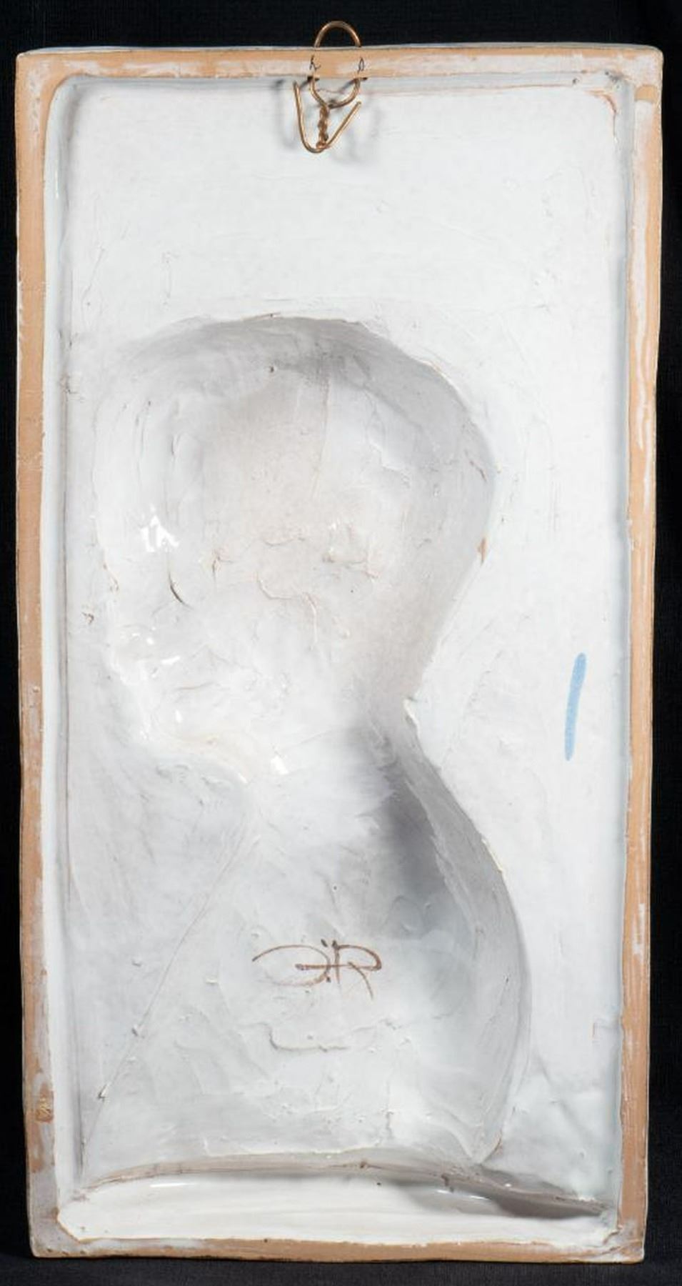 The plaque glazed terracotta, signed on back and stamped on bottom: "D(B?)R." 19in. x 9 1/2in. x 2 1/2in. Good condition; no chips/cracks found.