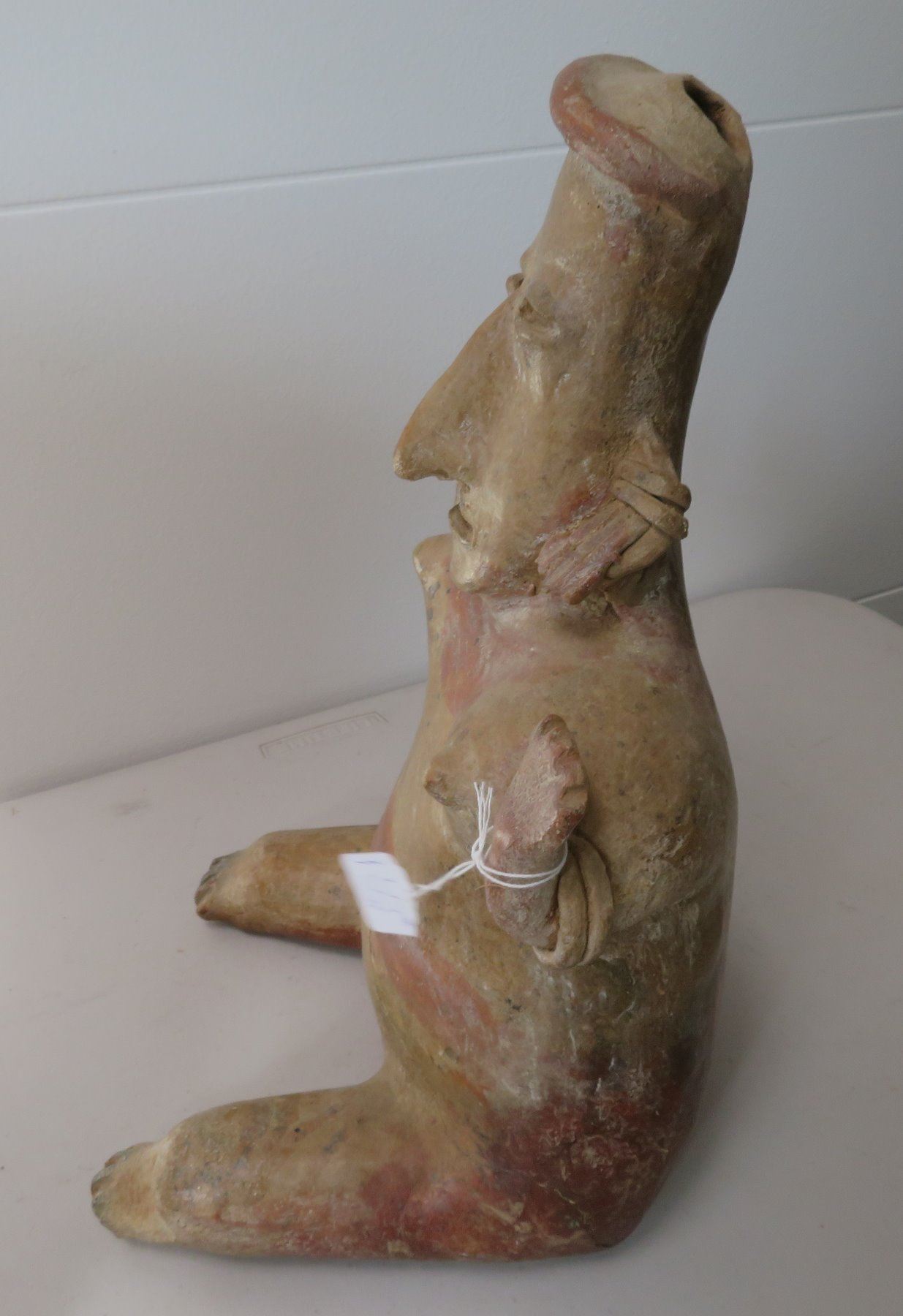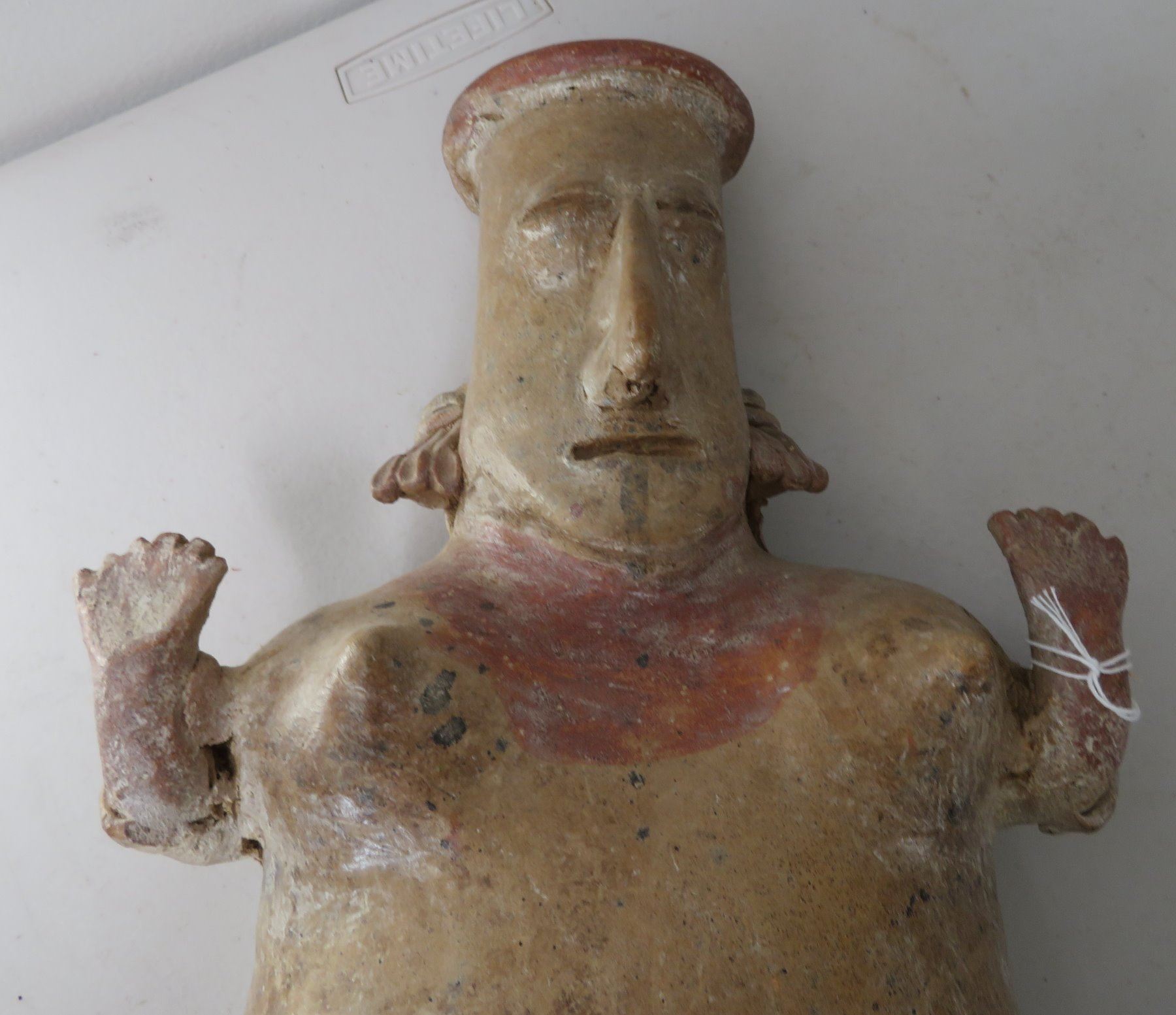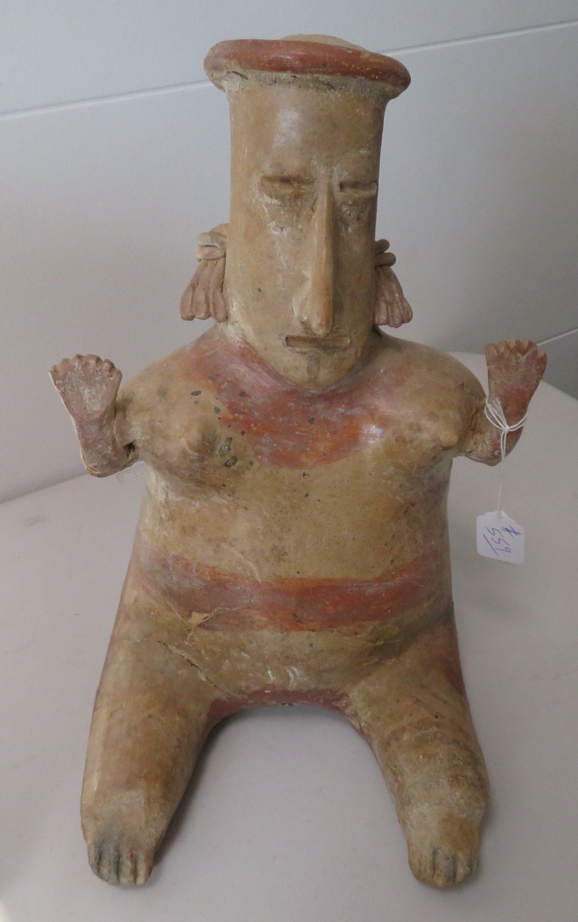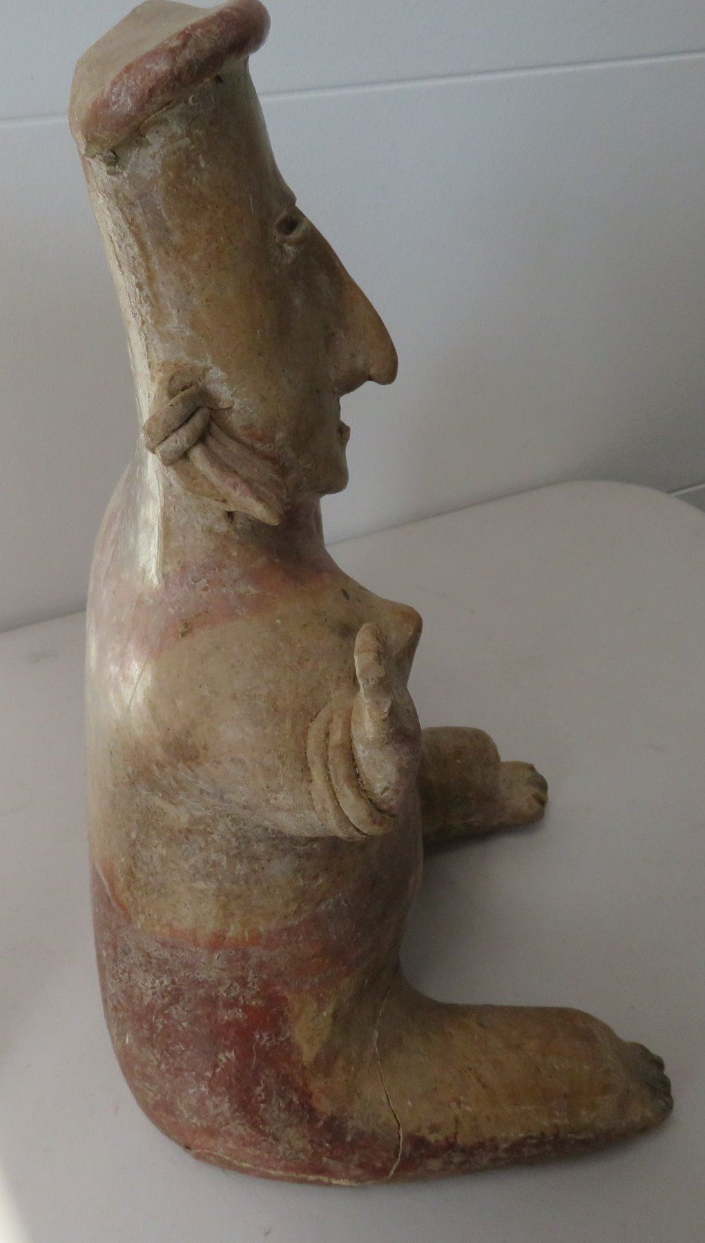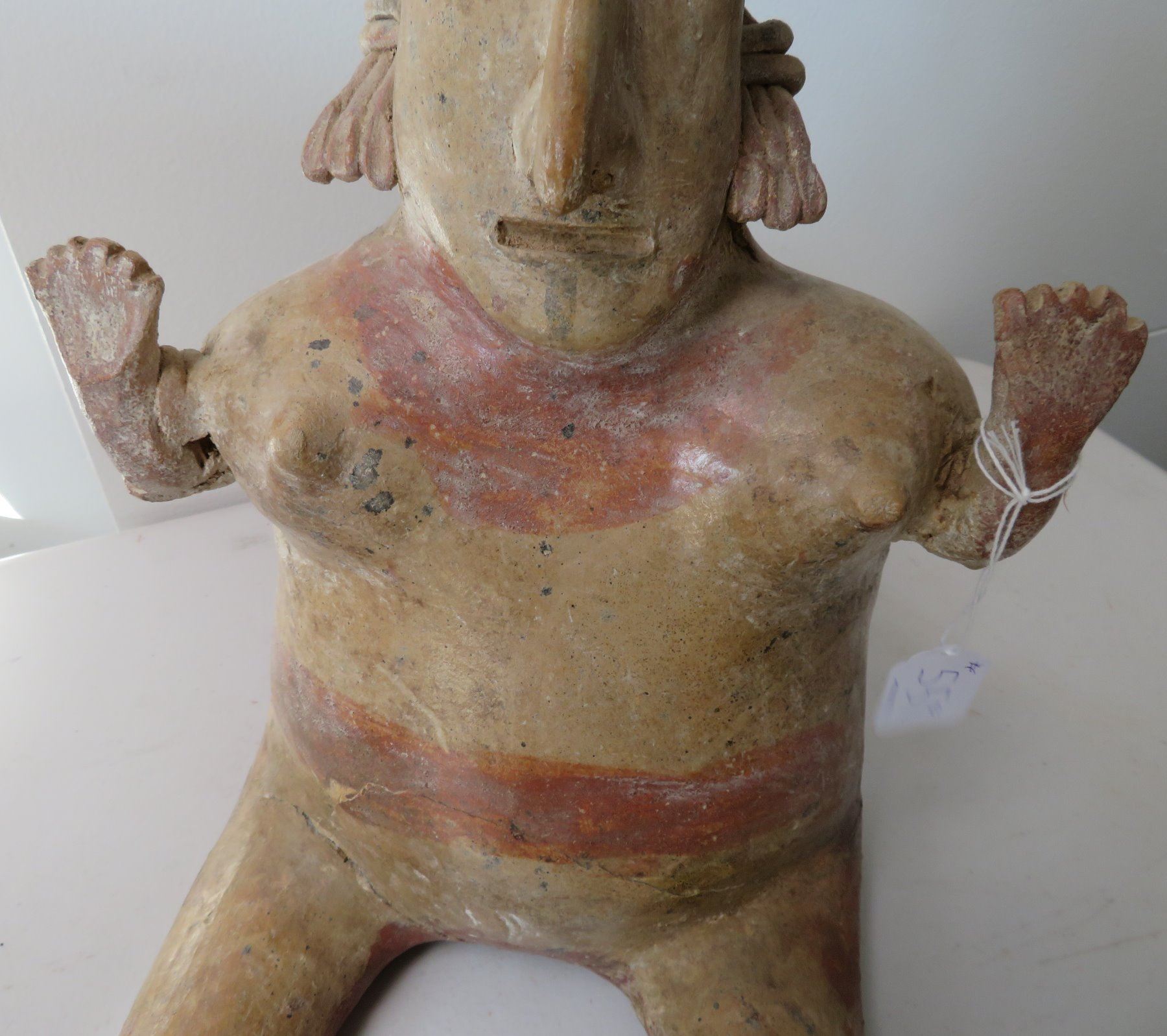 Large Ceramic Woman, pre-Columbian item. Made of clay and paint, the item measures 15 1/2" x 9" x 8". Jalisco, Mexico. Piece missing on bottom. From an old and large, Rancho Sante Fe, Calif. estate, originally collected by a dentist. Condition: Broken and glued, see images. Shipping: $70.00 USA estimate only, due to size, weight and value, double-boxed.