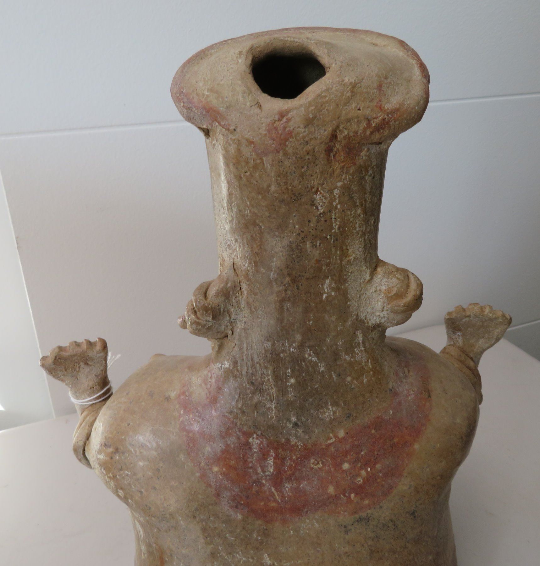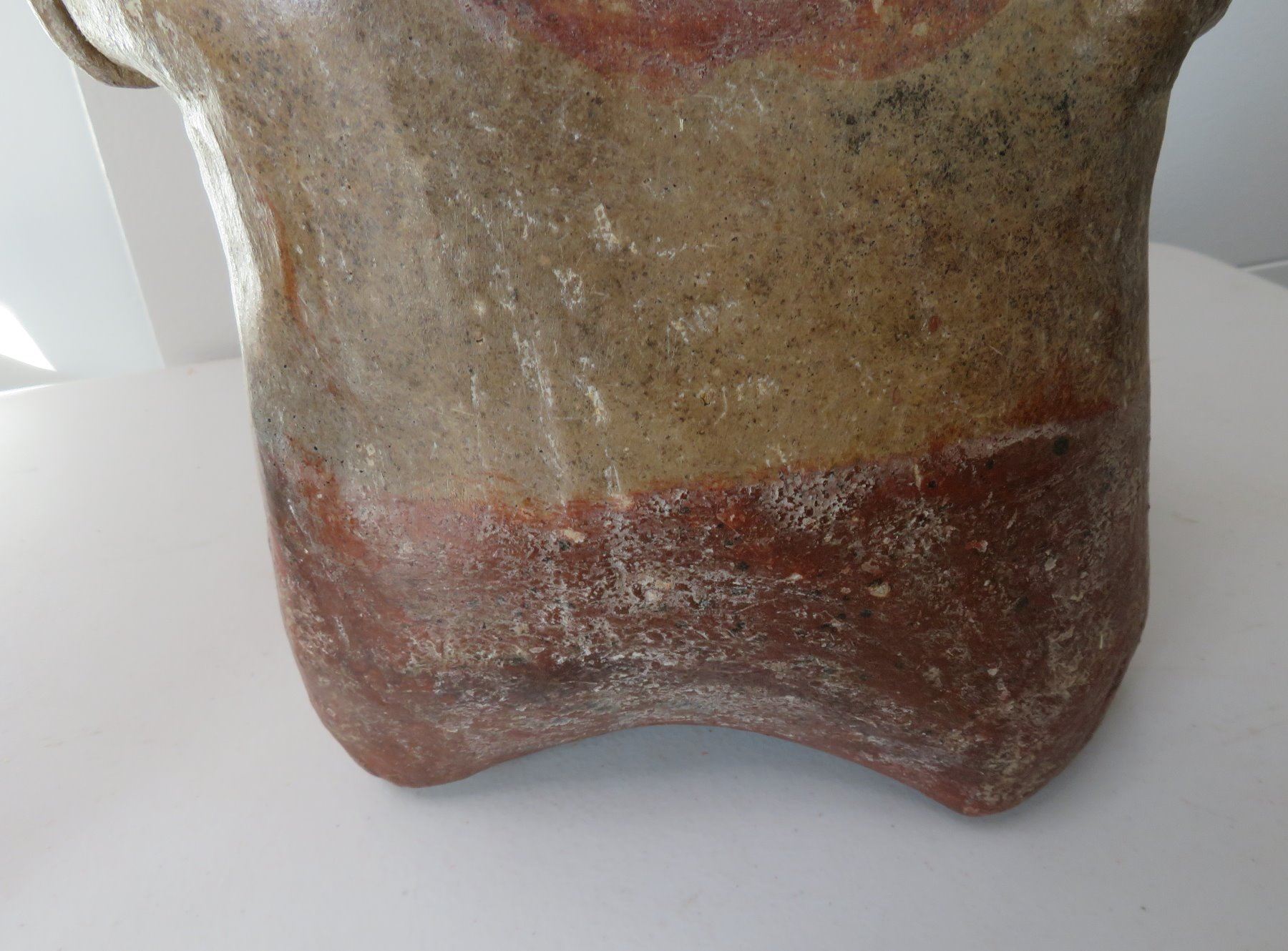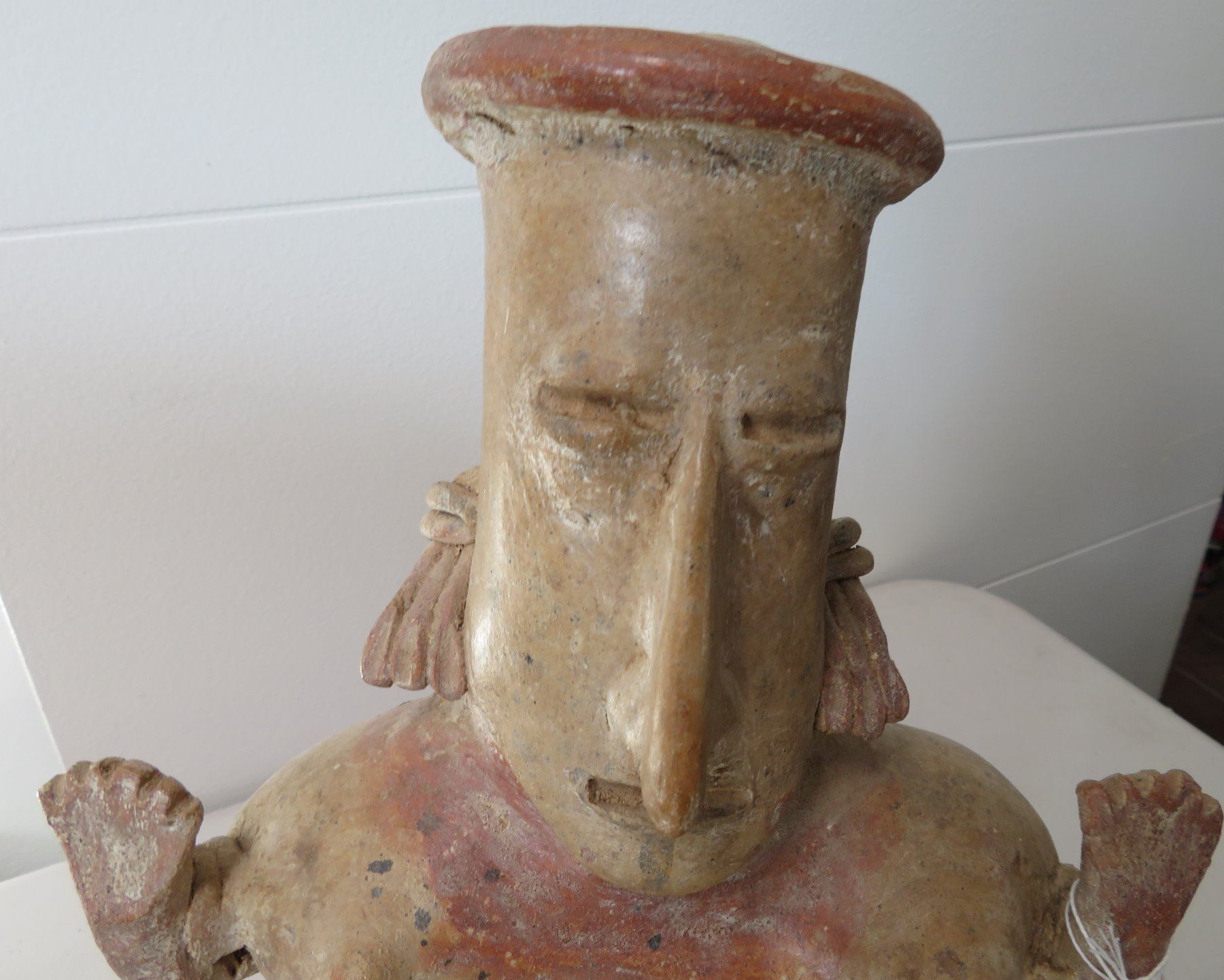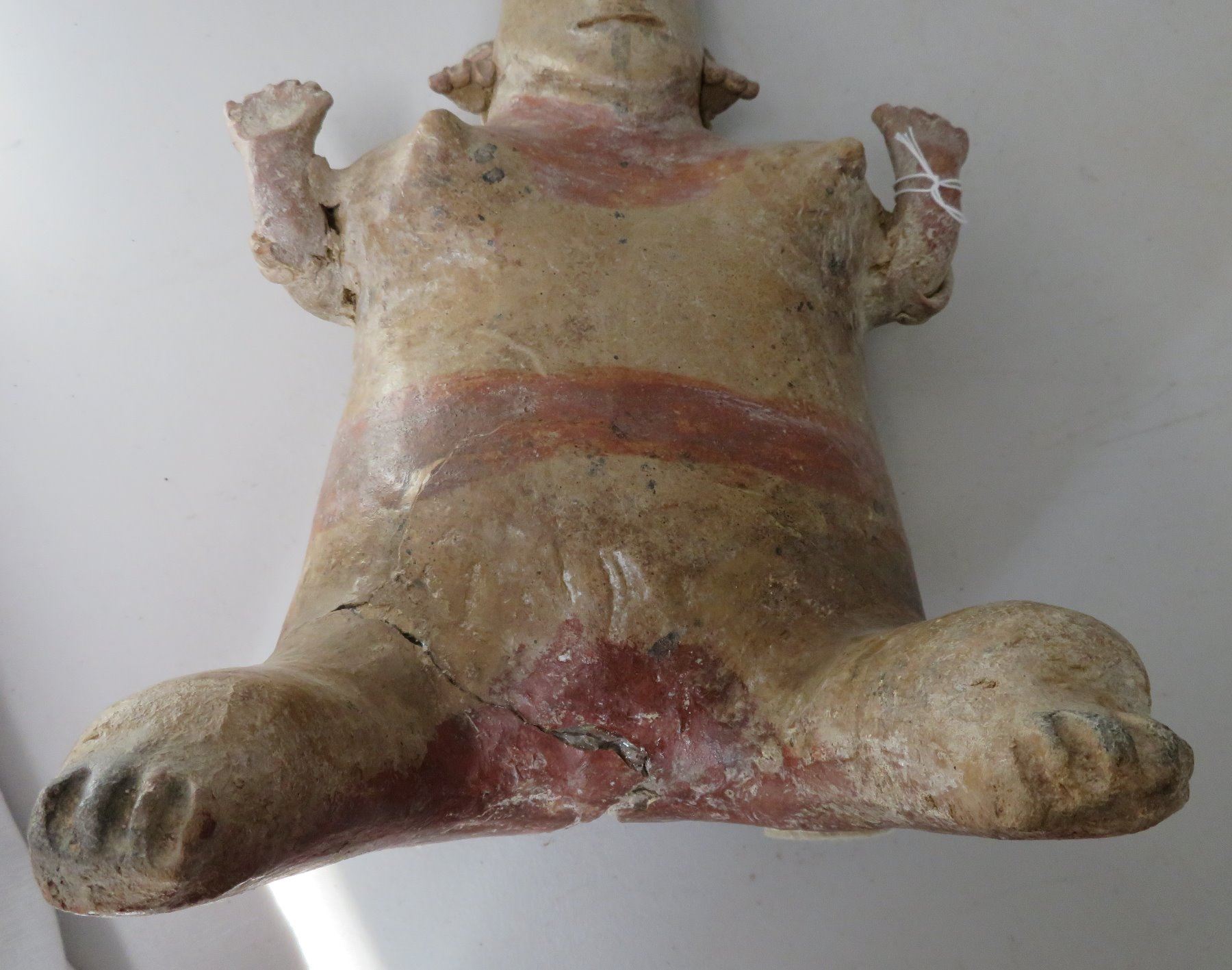 Large Ceramic Woman, pre-Columbian item. Made of clay and paint, the item measures 15 1/2" x 9" x 8". Jalisco, Mexico. Piece missing on bottom. From an old and large, Rancho Sante Fe, Calif. estate, originally collected by a dentist. Condition: Broken and glued, see images. Shipping: $70.00 USA estimate only, due to size, weight and value, double-boxed.