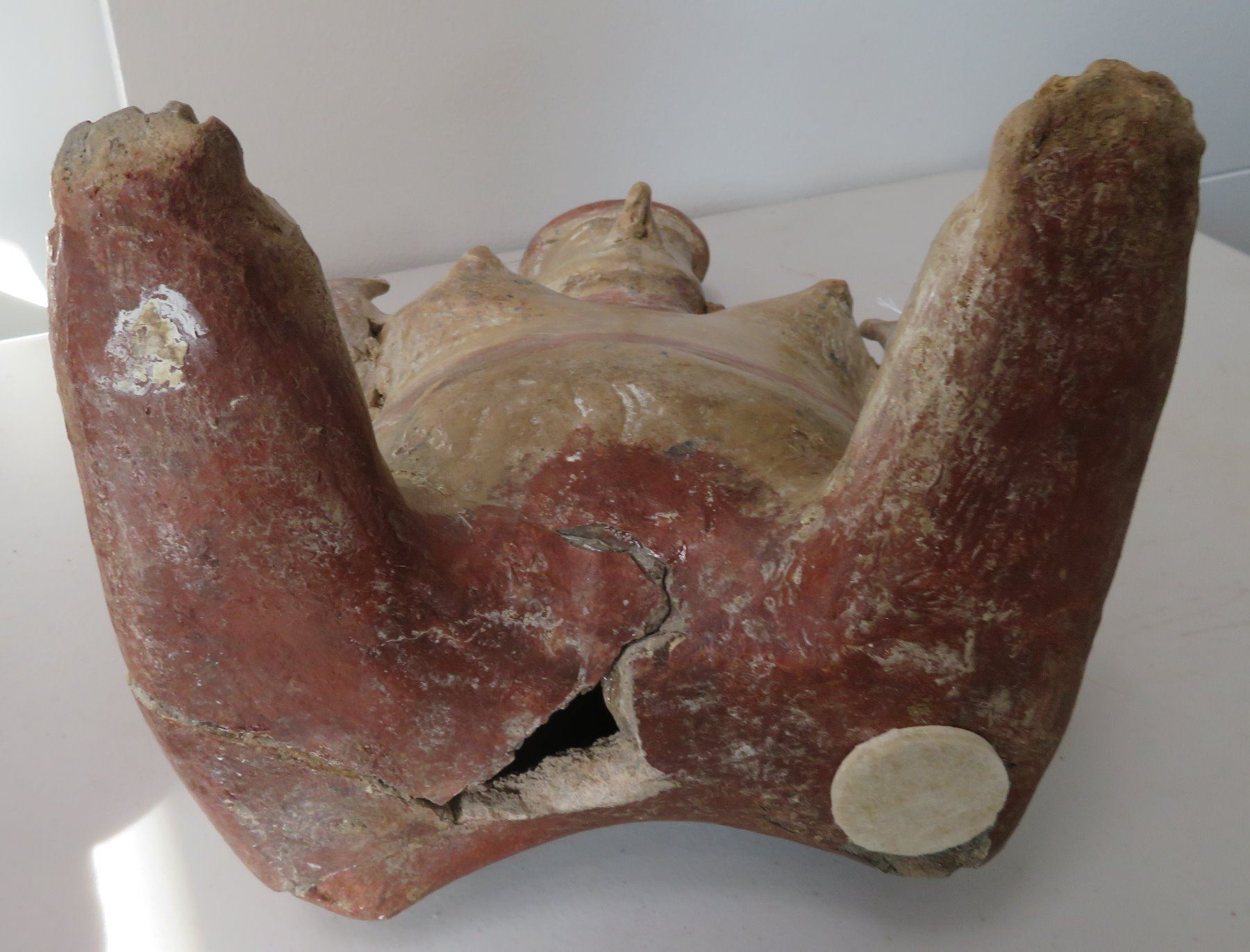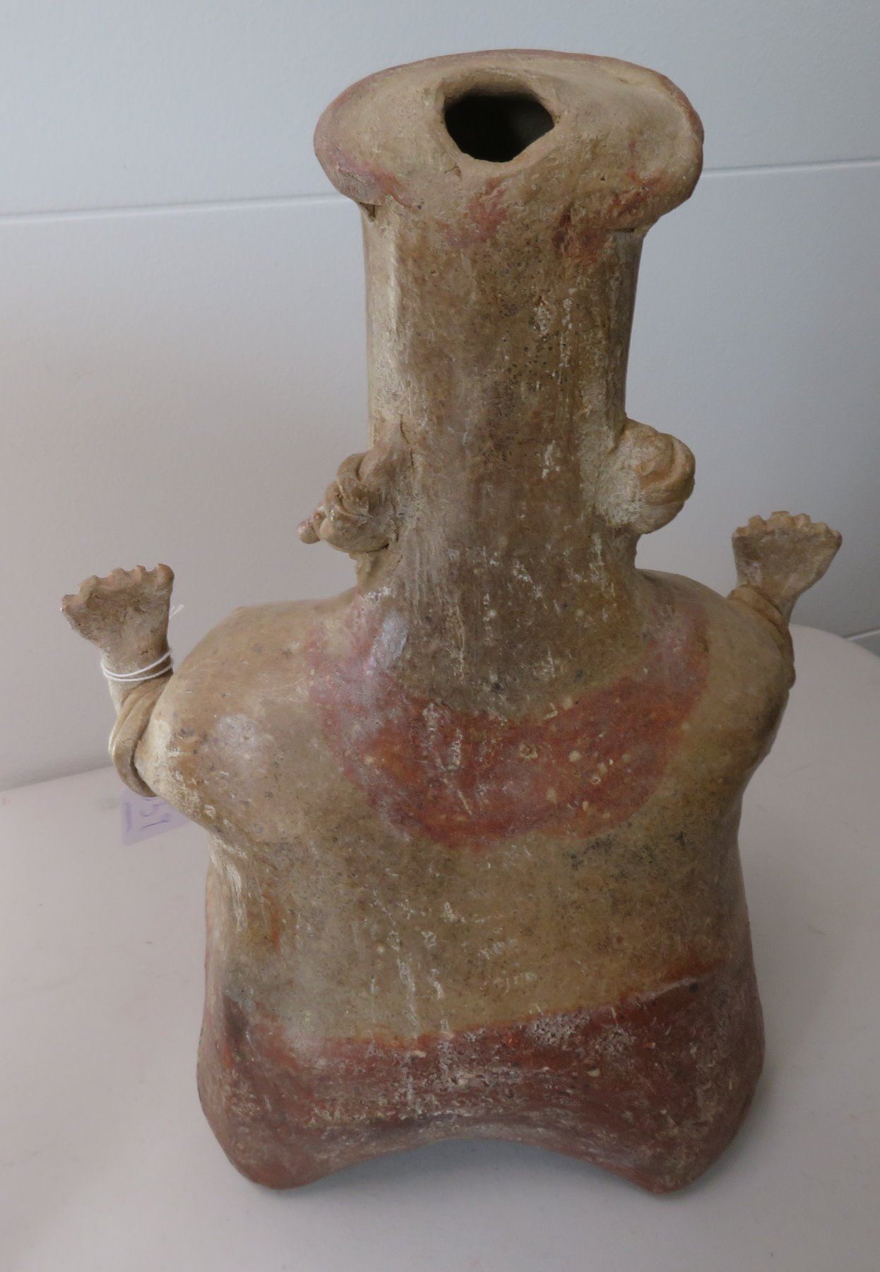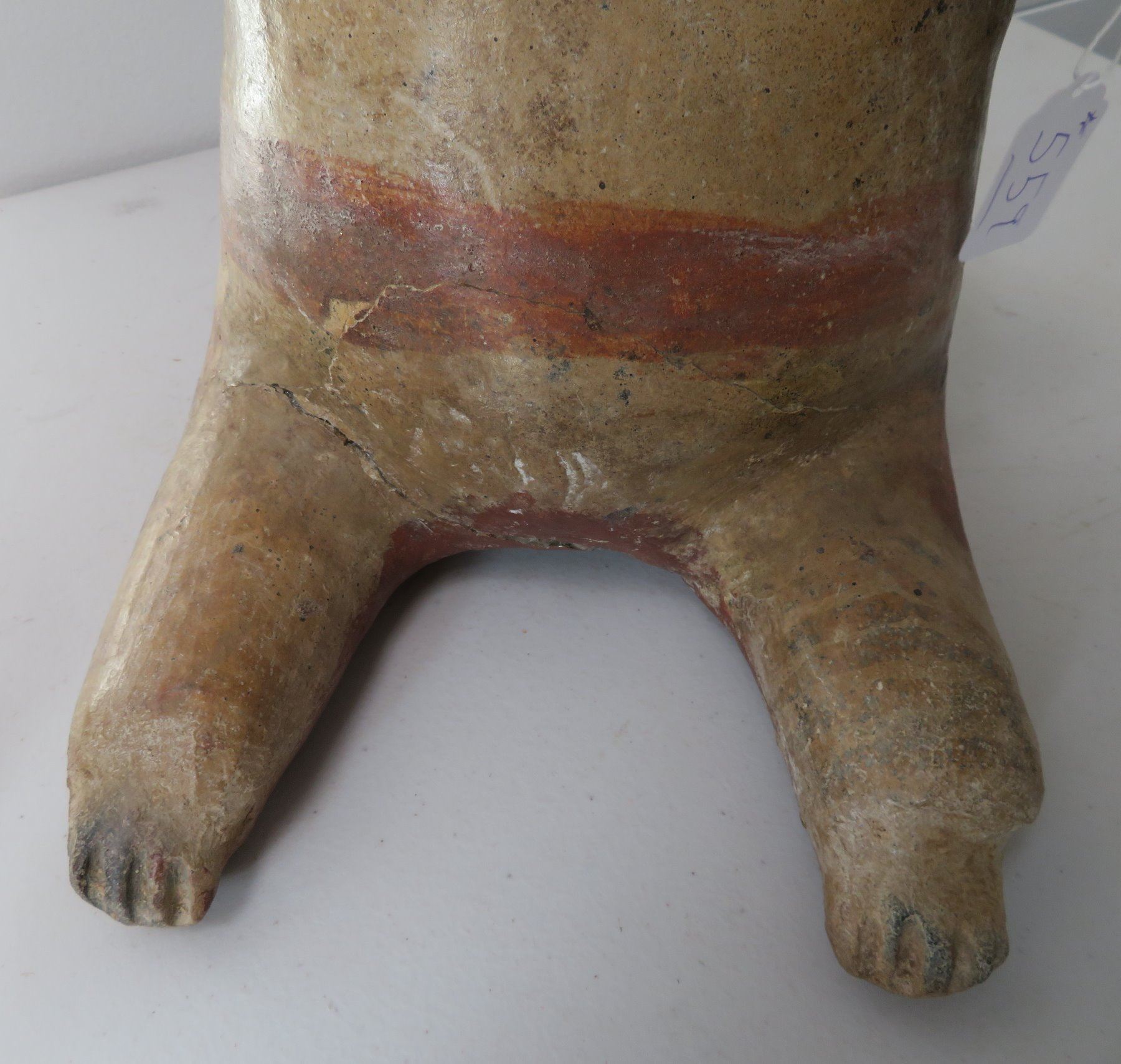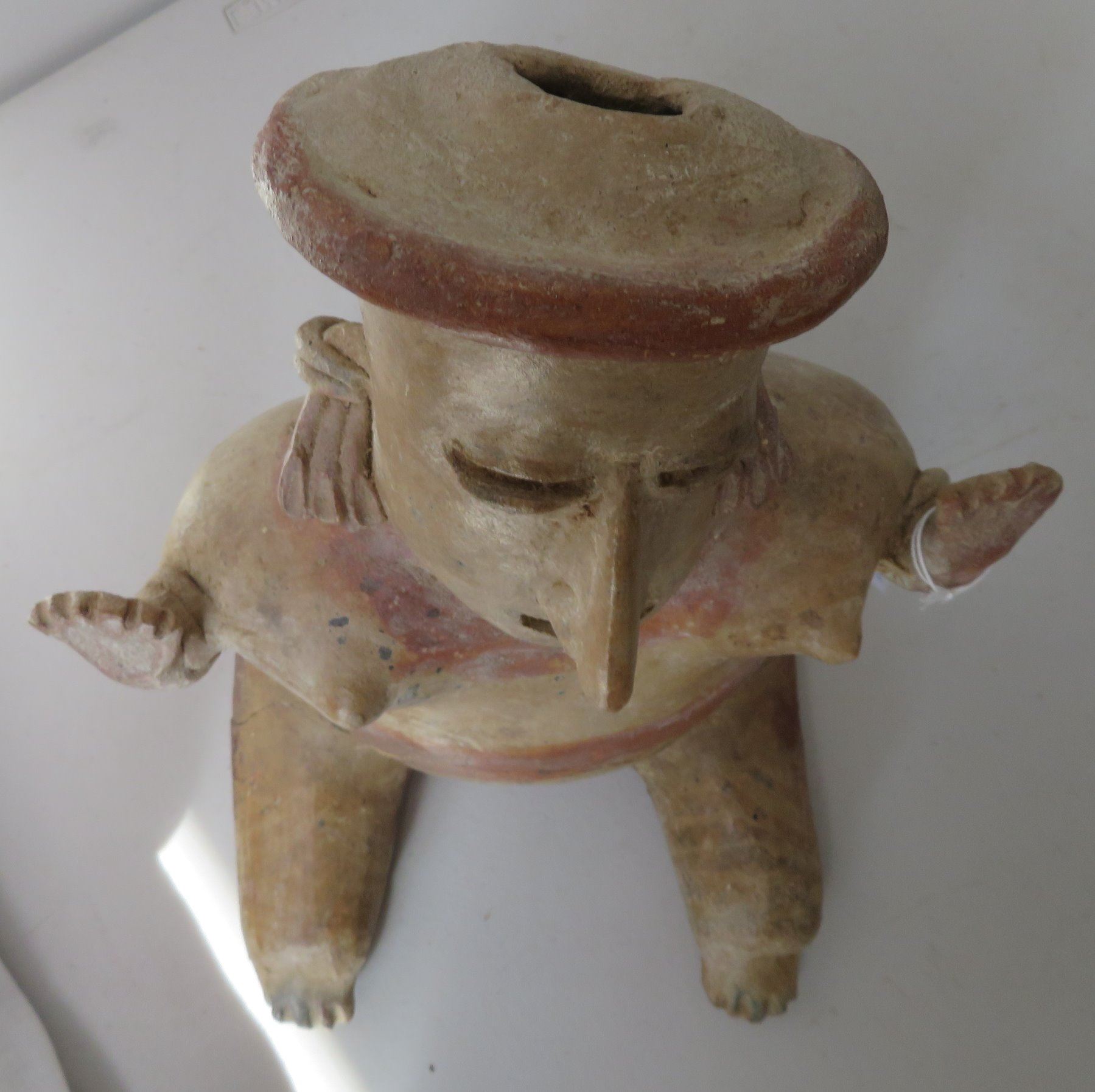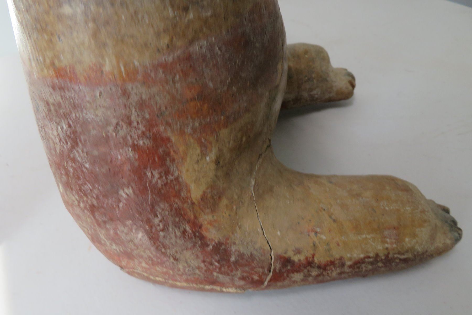 Large Ceramic Woman, pre-Columbian item. Made of clay and paint, the item measures 15 1/2" x 9" x 8". Jalisco, Mexico. Piece missing on bottom. From an old and large, Rancho Sante Fe, Calif. estate, originally collected by a dentist. Condition: Broken and glued, see images. Shipping: $70.00 USA estimate only, due to size, weight and value, double-boxed.