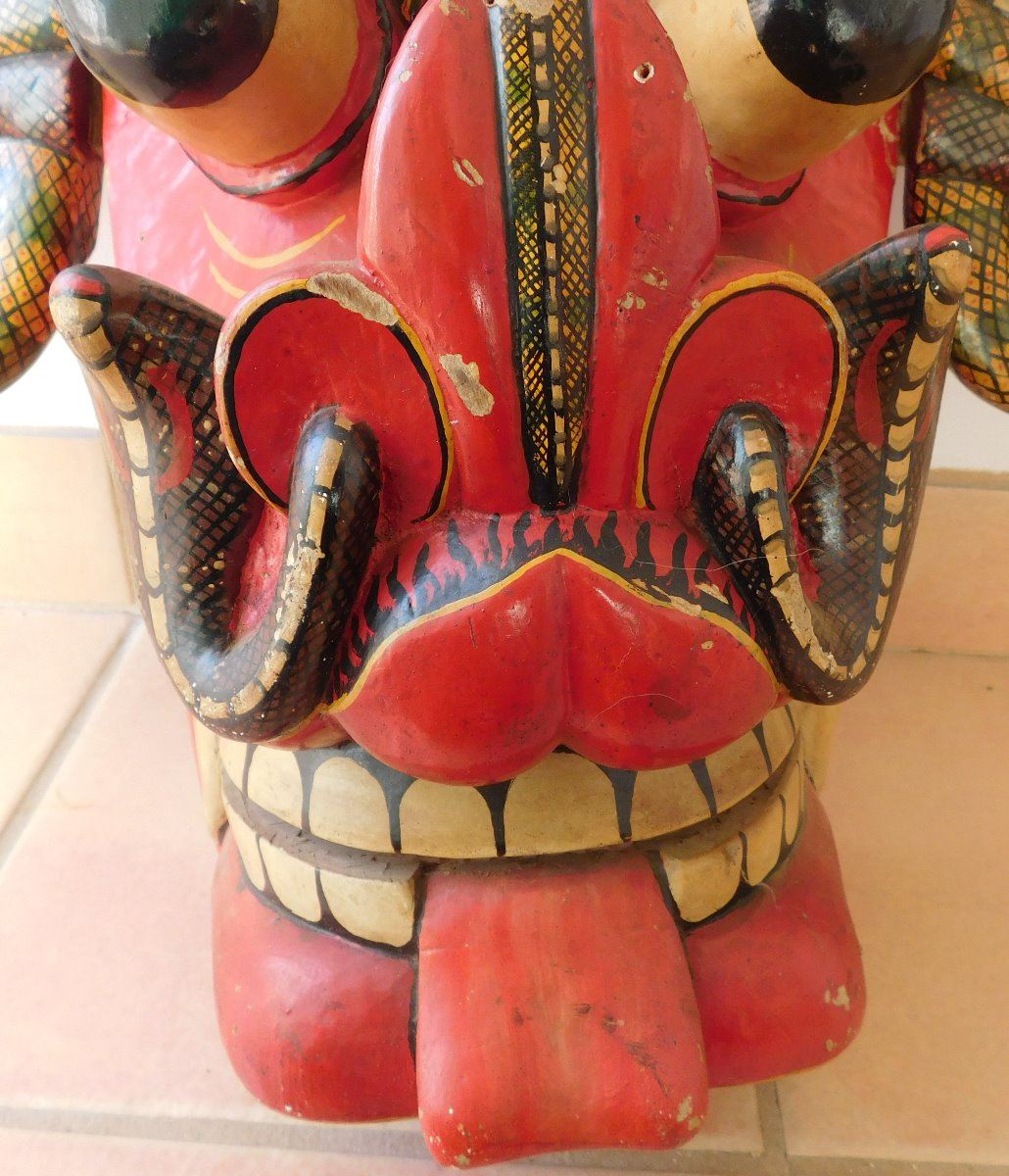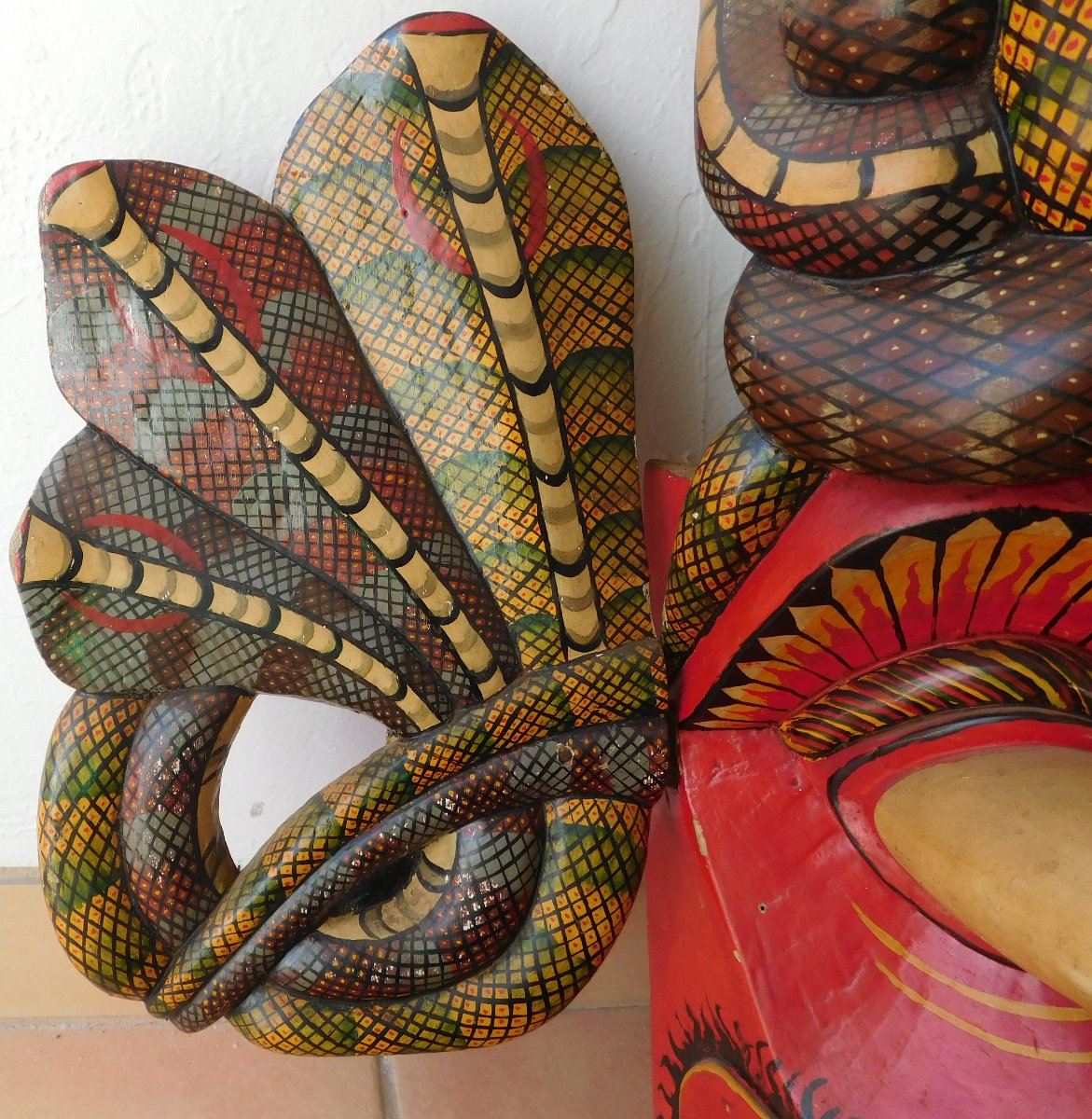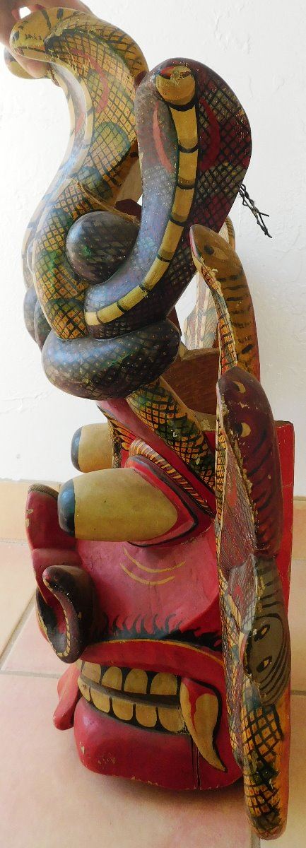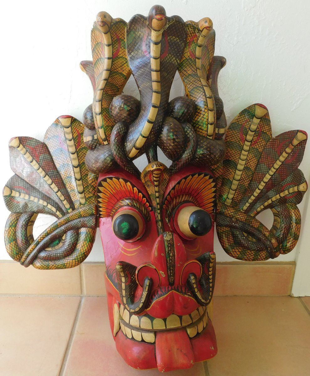Large Ceylon Wood Mask, circa 1940s. Made of wood and paint, the item measures 27" x 26" x 10". Ceylon, Tribal area, Sri Lanka. Very colorful mask with detachable ears. Condition: Good, see images. Shipping: $50.00 USA estimate only w/insurance and signature, buyer pays all shipping fees.