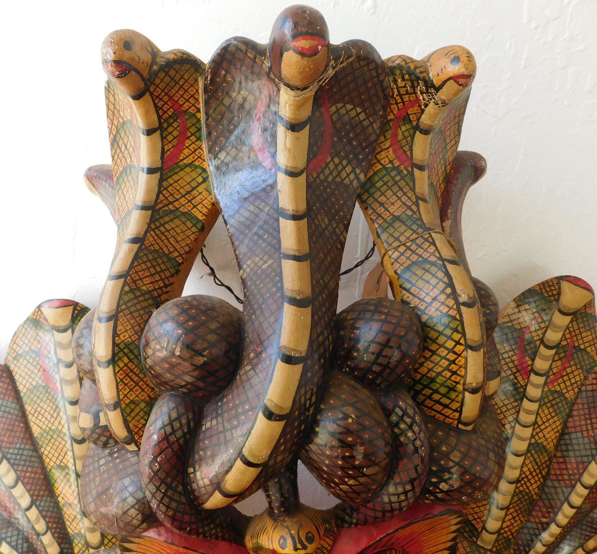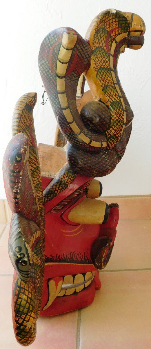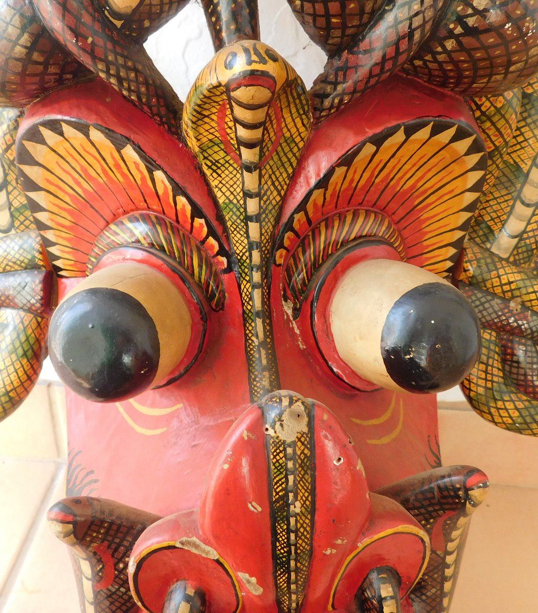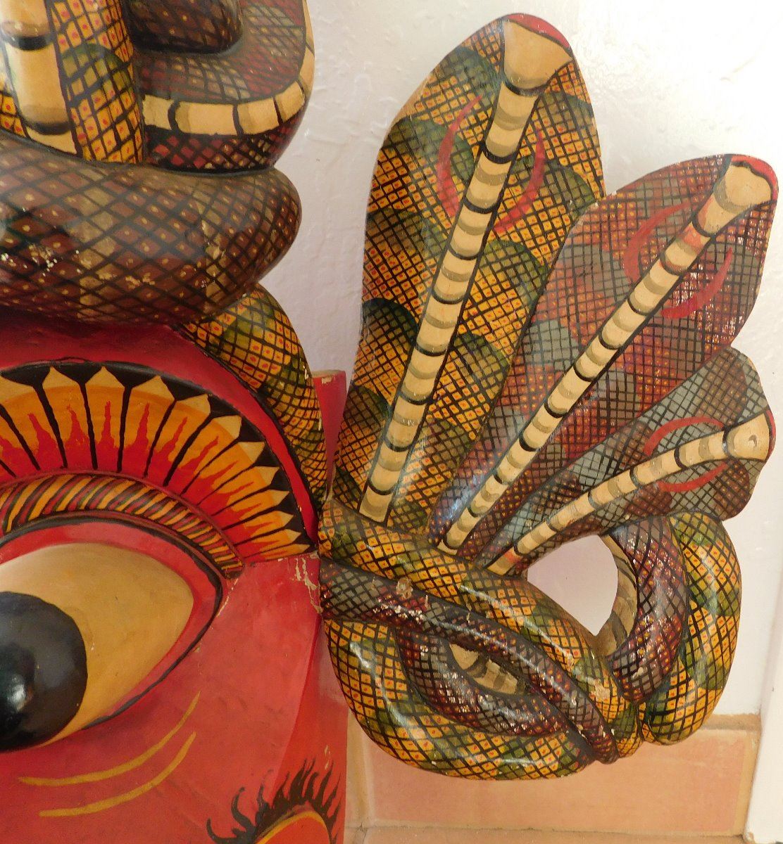 Large Ceylon Wood Mask, circa 1940s. Made of wood and paint, the item measures 27" x 26" x 10". Ceylon, Tribal area, Sri Lanka. Very colorful mask with detachable ears. Condition: Good, see images. Shipping: $50.00 USA estimate only w/insurance and signature, buyer pays all shipping fees.