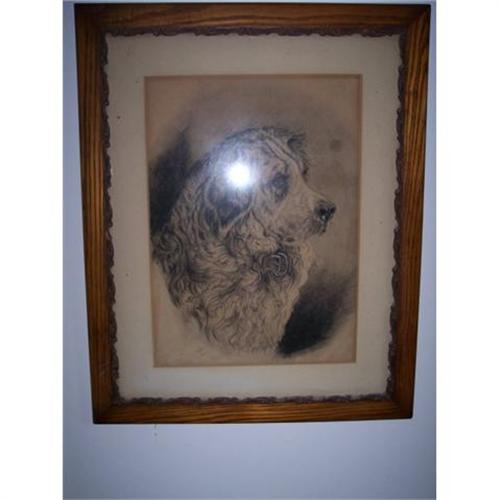 This is an absolutely wonderful charcoal drawing of a large fluffy dog.It has the signature AV I believe.I do not know who that stands for.I also can see no date but have not removed it from its frame as it has the original backing on with many nails.He looks like you could reach right in and hug him.The frame is also very nice with wonderful fancy trim on the inside of frame.A few little spots on the matting but this is usual with age.The frame measures 26 x 21 1/4".I am guessing as to the age as I can find no date but the frame I would say is from the early 1900s so I am guessing that for the date.