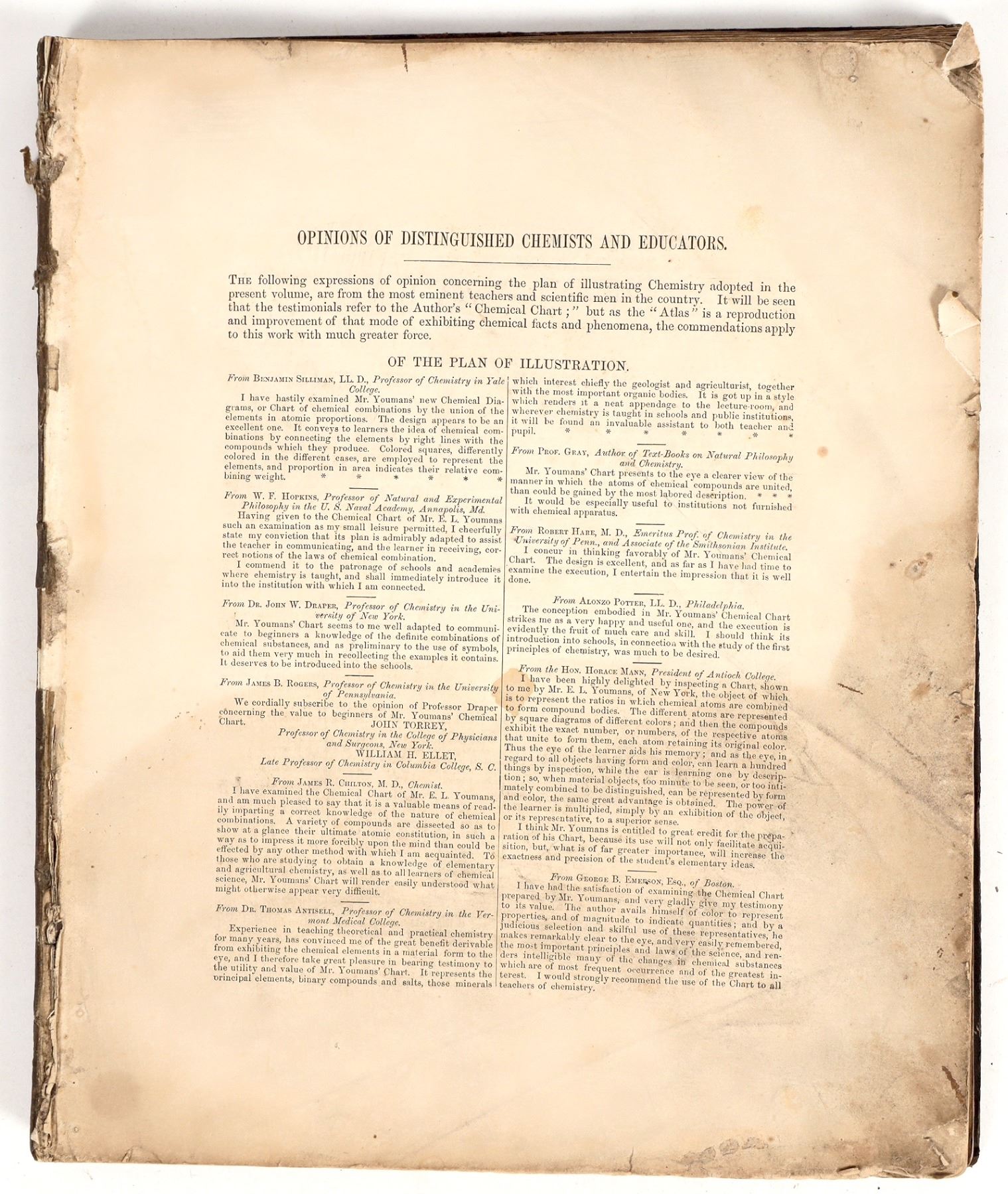 Large chemistry book with color diagrams. Page count appears to be complete. Detached spine, though binding appears to remain sturdy. Light foxing throughout. Front cover missing. Back cover is a gorgeous dark brown with indented swirling patterns decorating the corners. About 100 pages long. "Chemical Atlas" by Youmans, Edward L. Measures 10x12.25x.5". Please inspect photo.