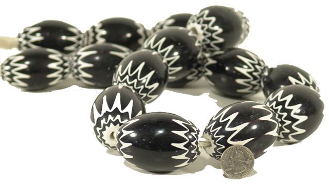 Late 1900s, Long strand of 16 extra large, highly polished, six layer Asian chevron tradebeads with tapered ends - black. 2-1/4"