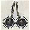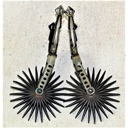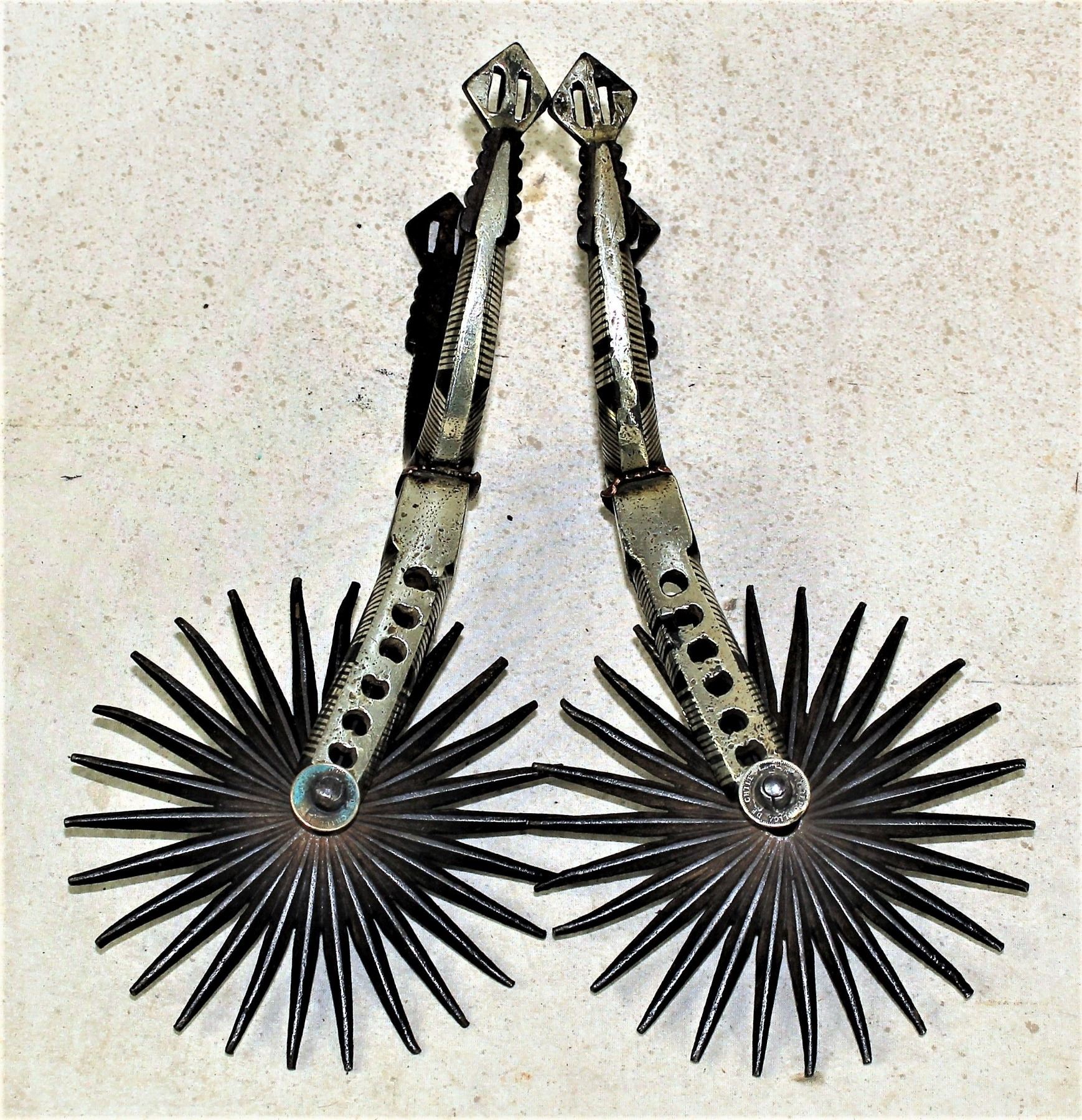 An impressive gigantic pair of Argentine double mounted spurs, adorned with old coins and huge 5" multi-point rowels.