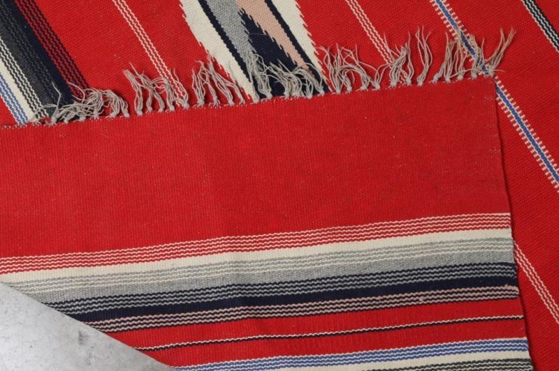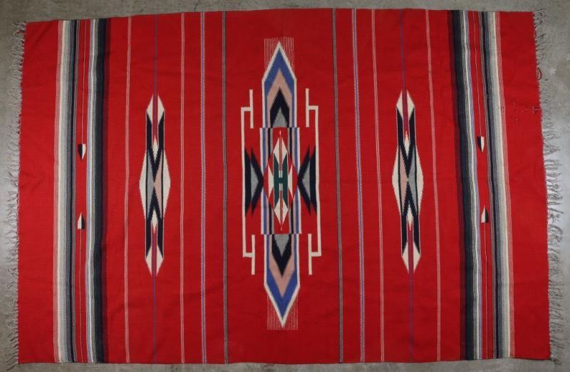 Circa 1930's-50's with geometric design with arrows. Measures 80 " by 52". Large Chimayo rug in red, black, white and blue with fringe. Condition is overall good shows 4-5 small holes on one end.
