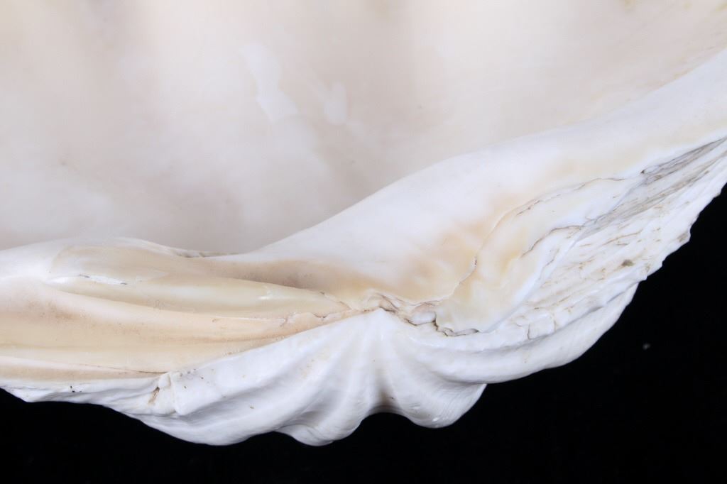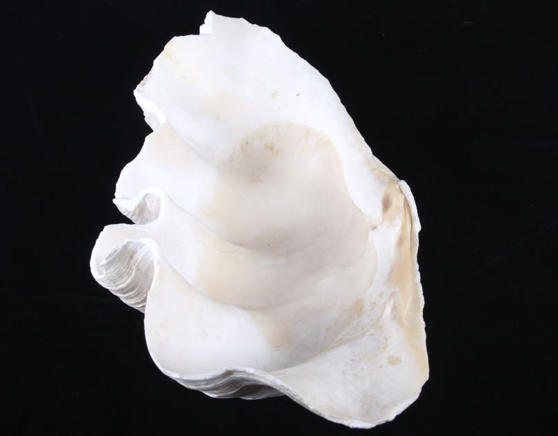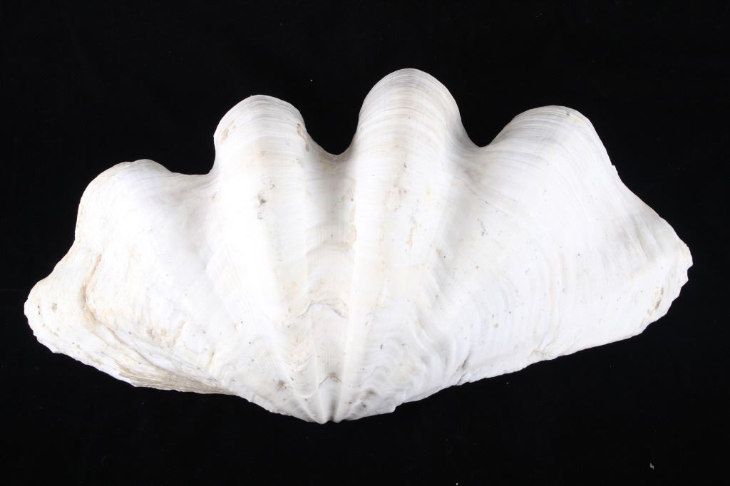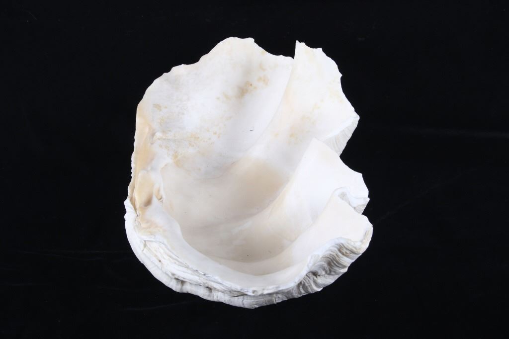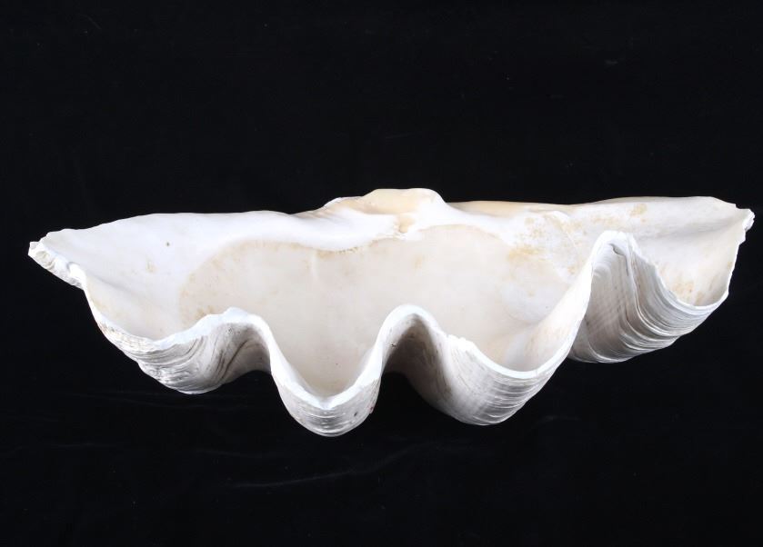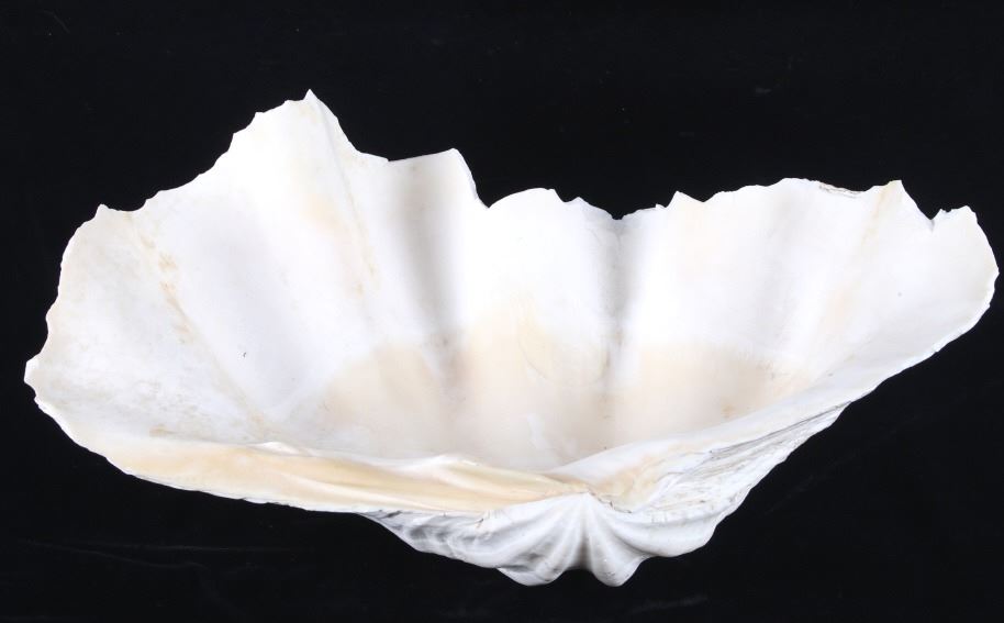 Available for your bidding pleasure is this large China Clam half shell. A clam is a marine bivalve mollusk. The shell consists of two halves, which usually share the same size. This shell shows white on the outer shell and a soft cream on the inner shell. The edges of the shell have been broken, but it still makes for a striking "display bowl". It measures 16 3/4" long by 9 1/2" wide and 6 1/2" tall.