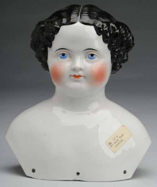Description Germany, Ca. 1860. Unmarked. Modified flat-top hairdo with white center part and graduated curls all around. Molded eye sockets with blue painted eyes, white dot highlight, red eyelid line and black eyelash line, closed mouth, rosy cheeks. Unusually large size. Condition (Excellent). Size 9" T.