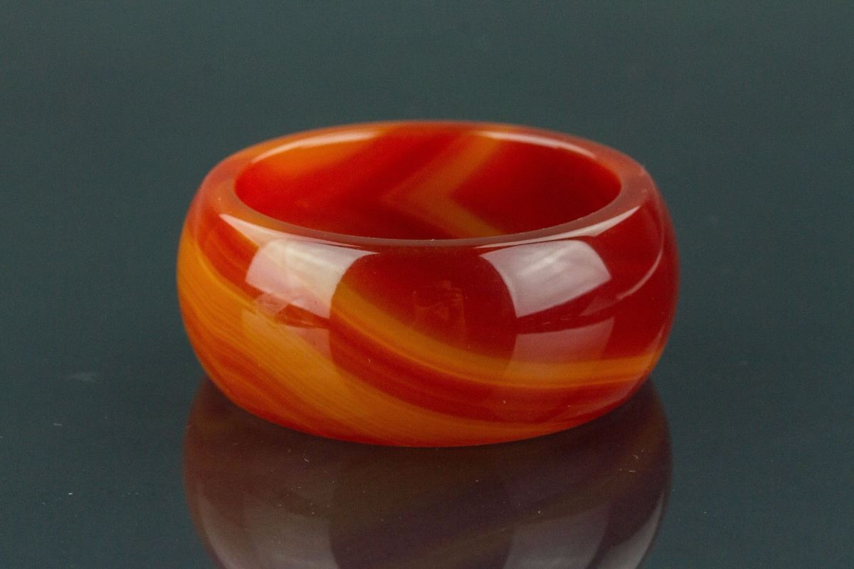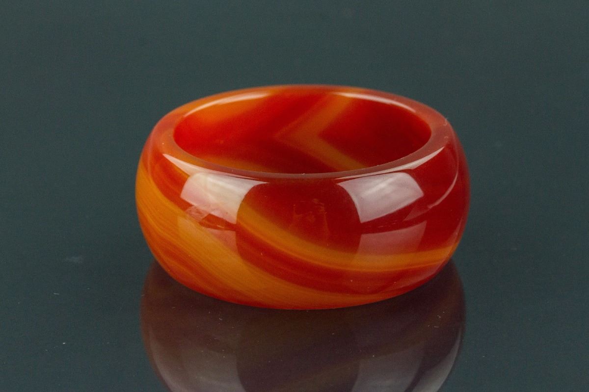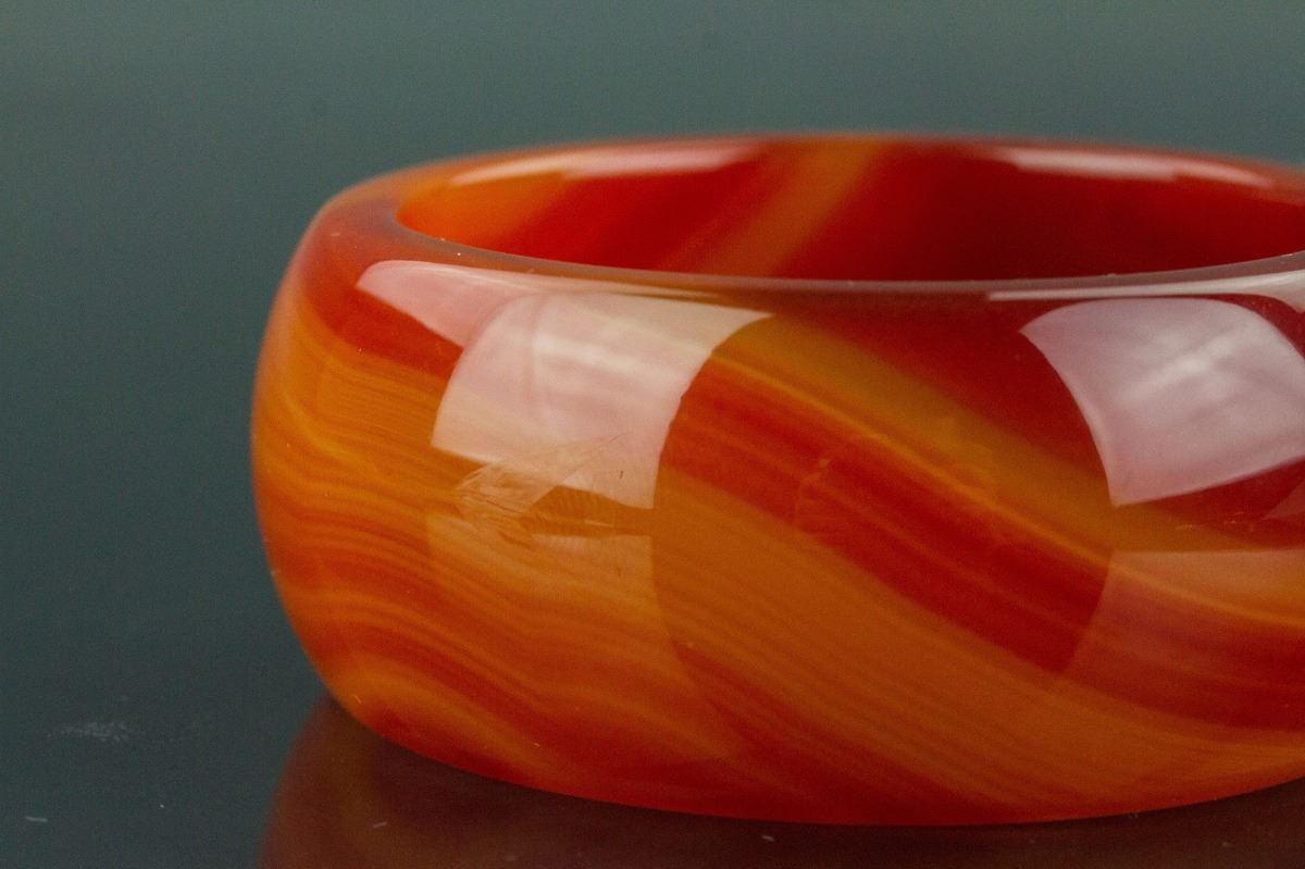Chinese large agate bangle; rounded outside and flatten inside; the stone of reddish orange tone with dark yellow streaks; D: 8 cm, 147 grams