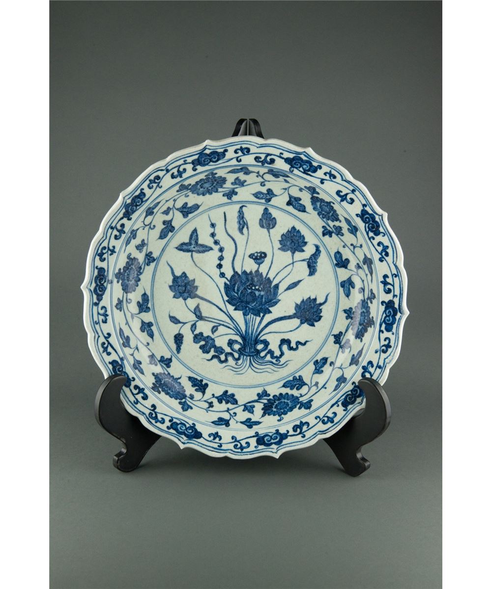 Large Chinese blue and white charger, with petal rim, finely painted Lotus and sprigs on the interior and exterior. Bottom marked six-characters Ming Xuande mark. H: 8 cm, D: 42 cm.