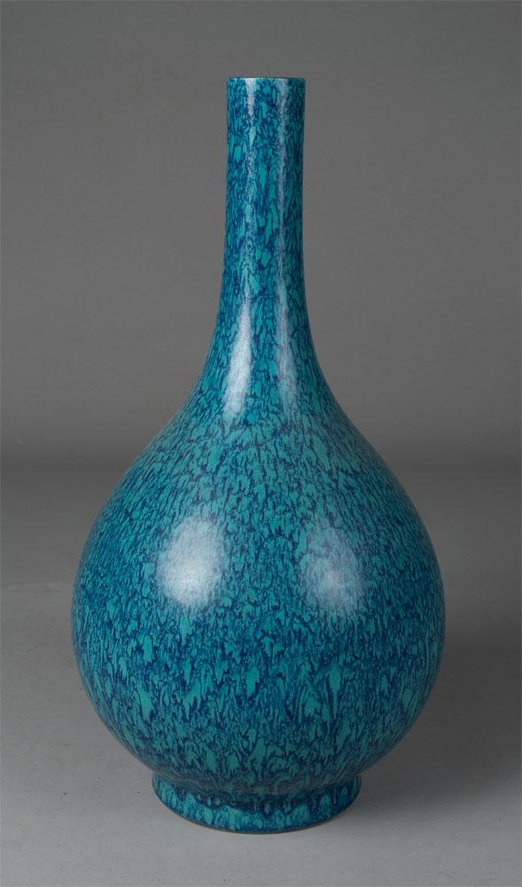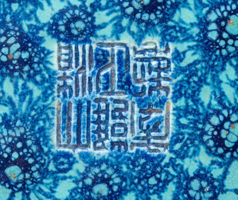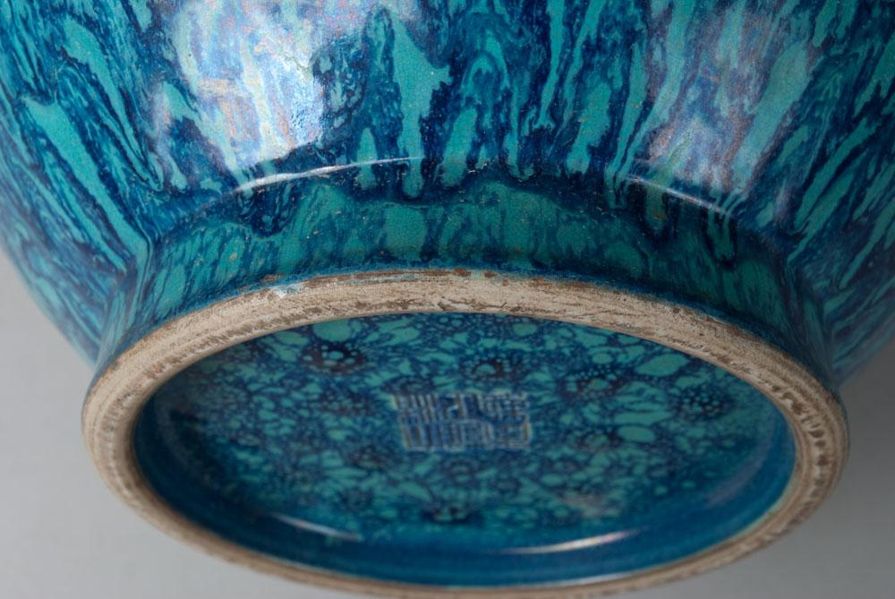 Of bulbous form with blue and turquoise drip glaze. 18" H x 9" W. Six character impressed mark for Great Yongxheng production on bottom. 19t/20th Century.