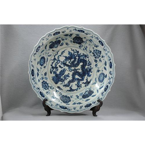 Large Chinese Blue and White Porcelain Plate. decor blue dragon and flowers as design. good condition.