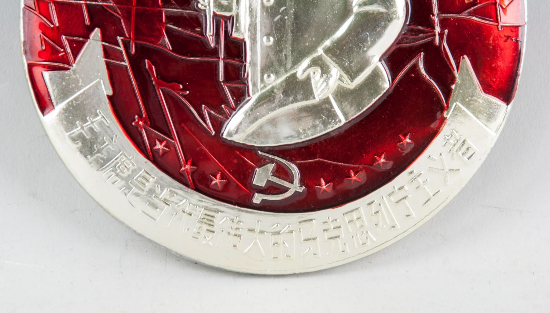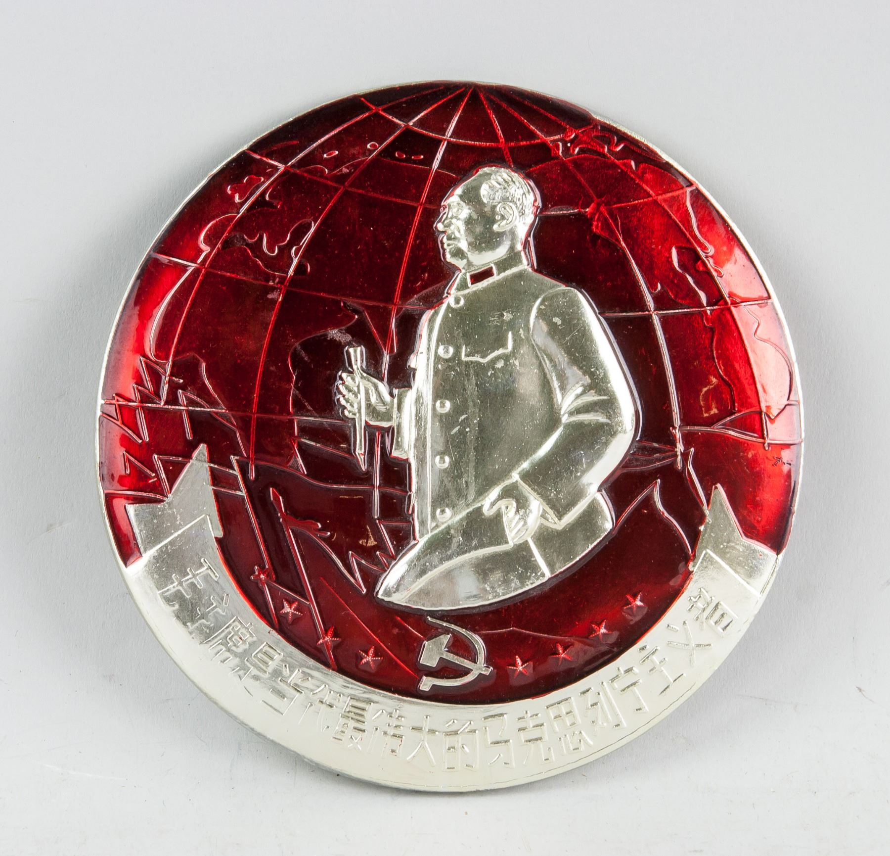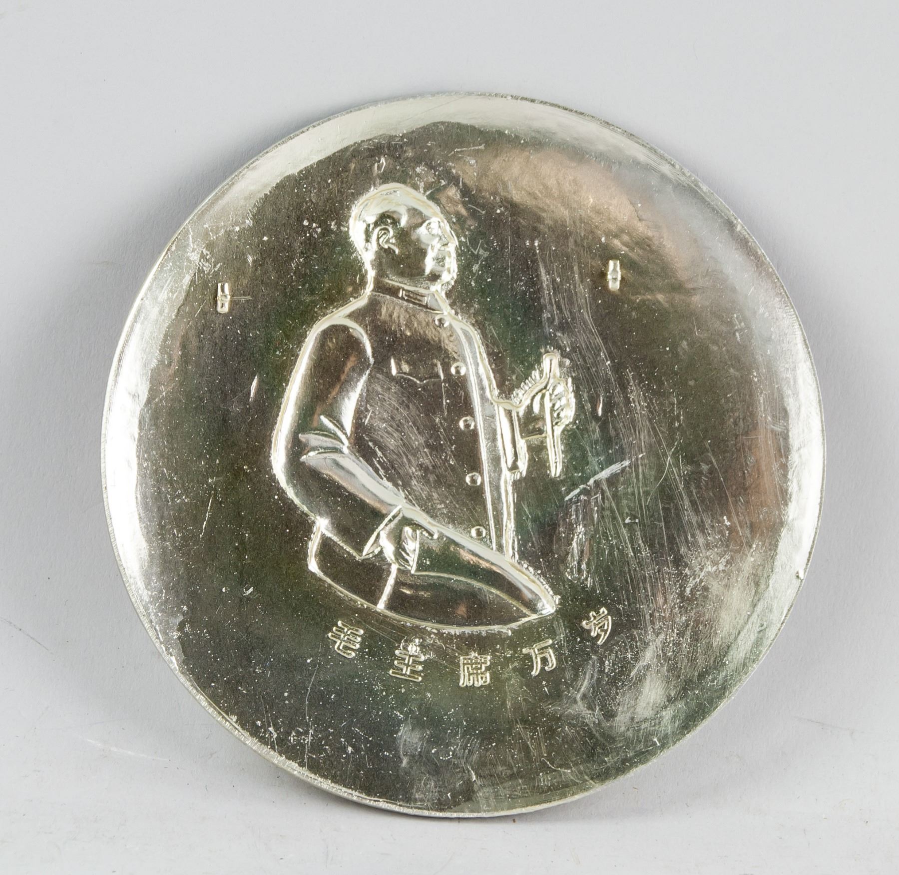 Chinese Chairman Mao Zedong, of round shape, obverse engraved standing Mao Zedong, lettering Mao Zhu Xi Shi Dang Dai Zui Wei Da De Ma Ke Si Lie Ning Zhu Yi Zhe, reverse lettering Mao Zhu Xi Wan Sui, D: 14 cm, 134 grams