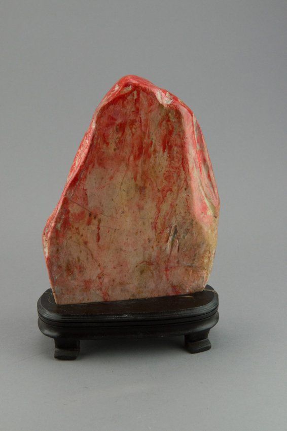 Large Chinese chicken blood stone boulder, on wood stand; H: 19 cm, W: 14 cm, 2443 grams