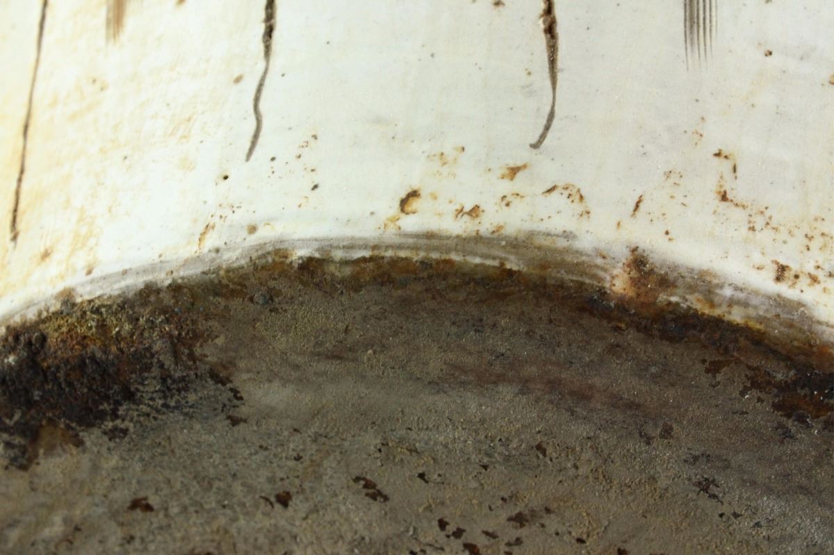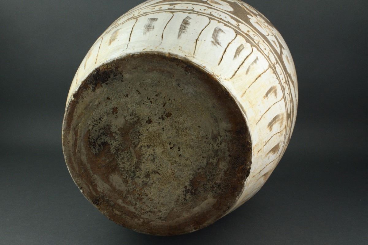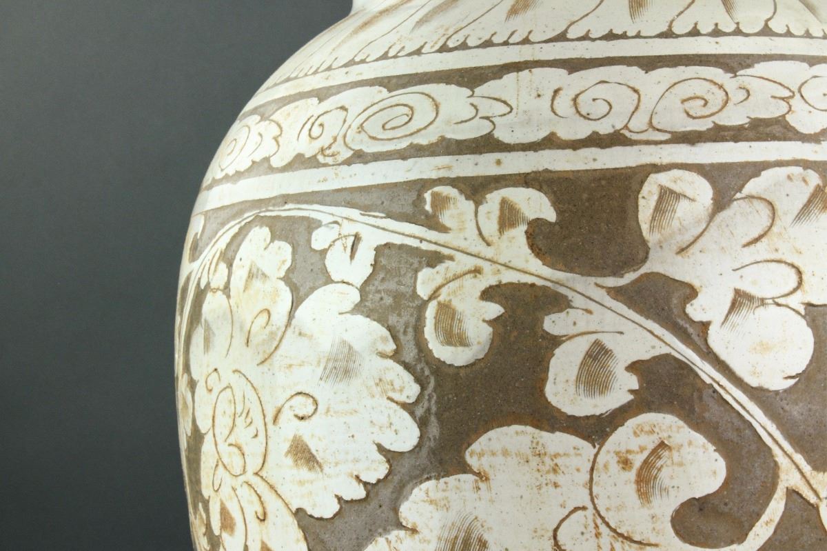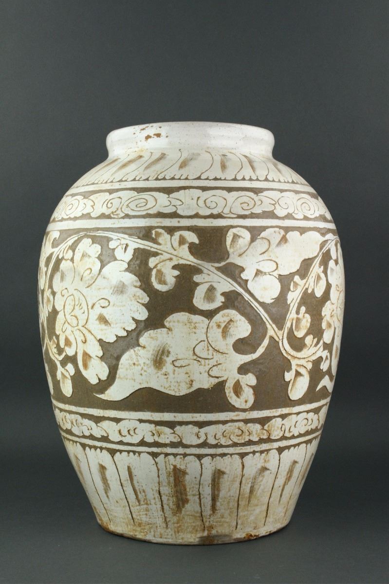 Large Chinese Cizhou potter jar; Song dynasty; of ovoid form with rounded rim; decorated with a wide band of carved peony scroll painted in brown glaze on white body; unglazed base