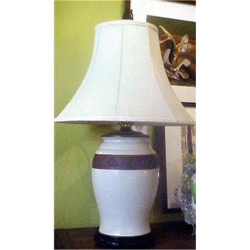 Offered here is a fine, large Chinese vase converted to a lamp. It is wheat color crackle glaze with an inlaid band of dark copper color (not metallic) with a bat motif. It is on a black Asian base and has a black pierced finial in an Asian design. The lamp stands about 28" high not including the finial, and is approximately 9" in diameter at the widest point. The shade is contemporary but not new.