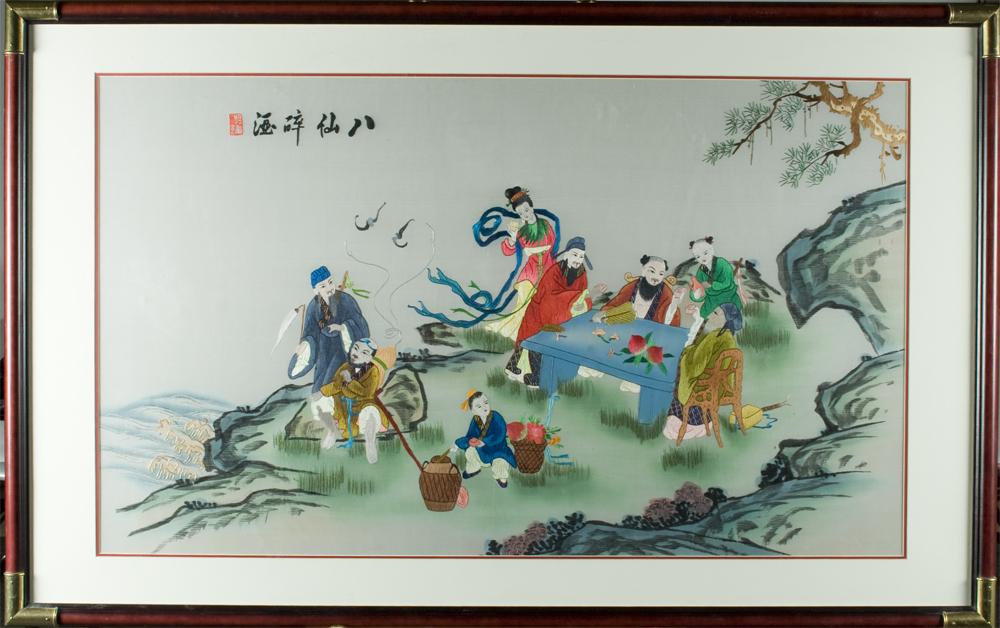 Very finely embroidered silk depicting several figures seated around a table, figures near the water, and another child figure with baskets, with additional painted colors. Embroidered seal mark and signature in UL. 25.5" H x 43.75" W (sight), double matted and framed behind glass.