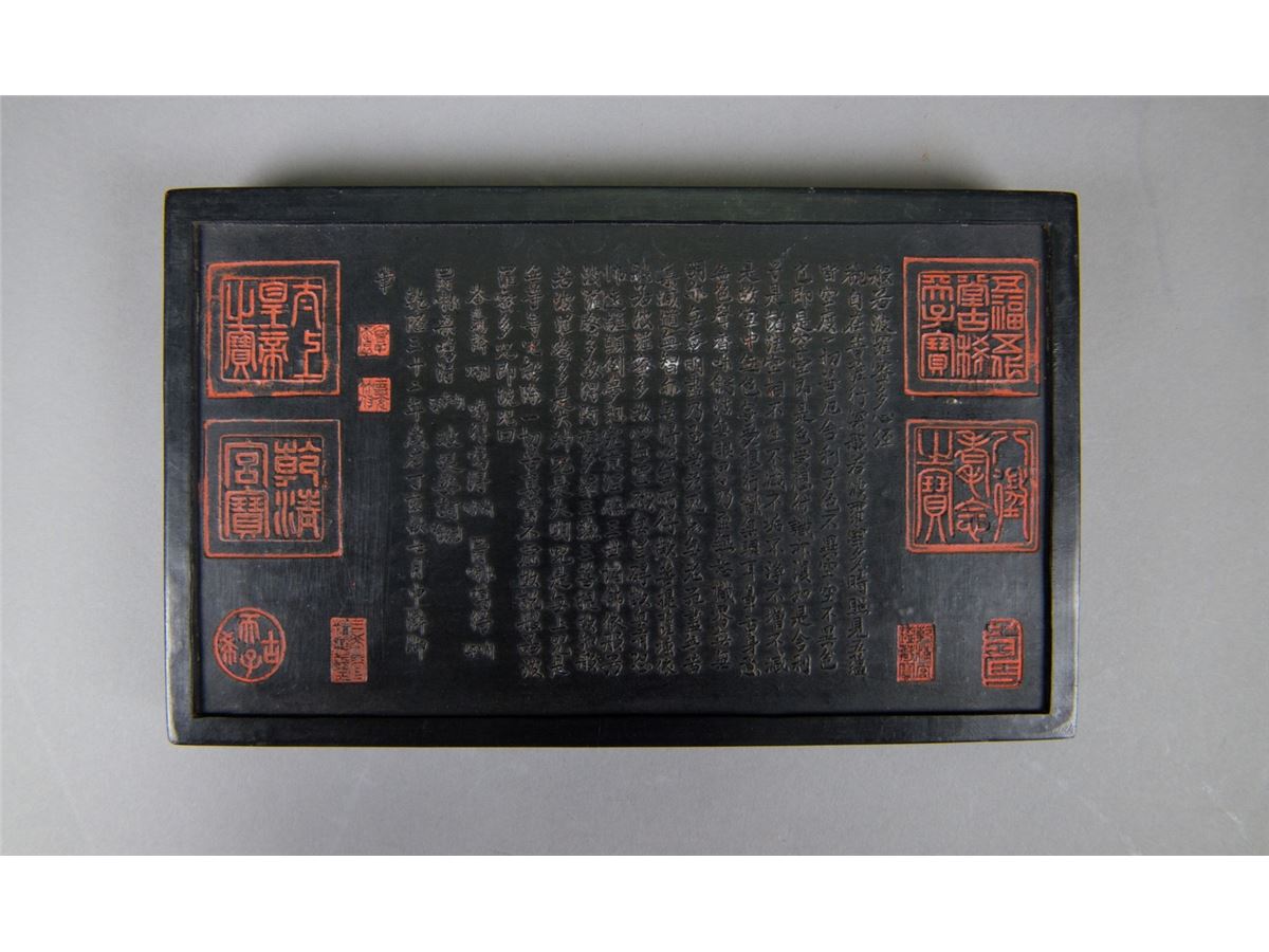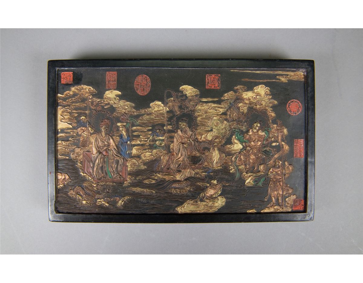 Large Chinese gilt ink stick; featuring figural Immortal scene amidst clouds; H: 13.5 cm, W: 22.5 cm, 950 grams