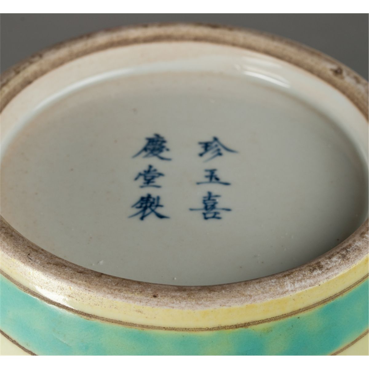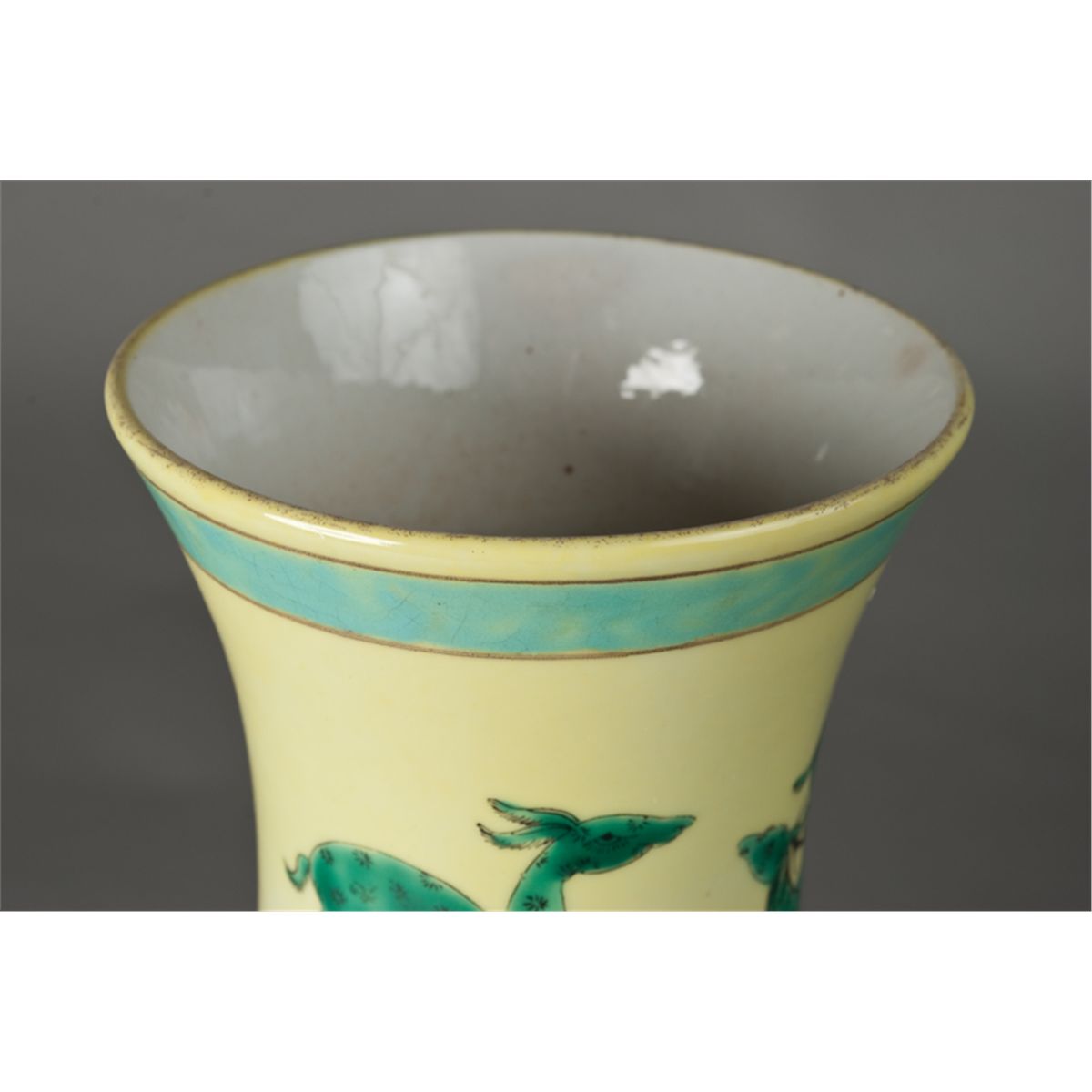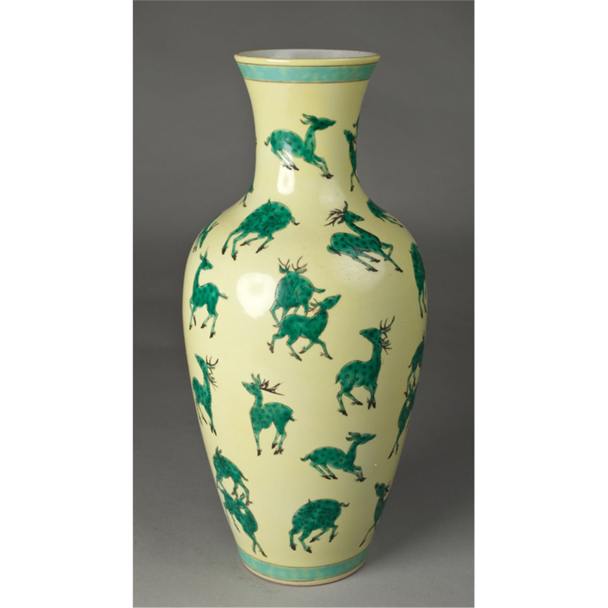 Yellow vase with numerous deer in varying positions in green glaze, mouth and bottom with band of turquoise glaze in-between two bands of gilt. Bears a six character mark in underglaze blue on underside. 18" H, 20th century. Private collection Rochester Hills, MI.