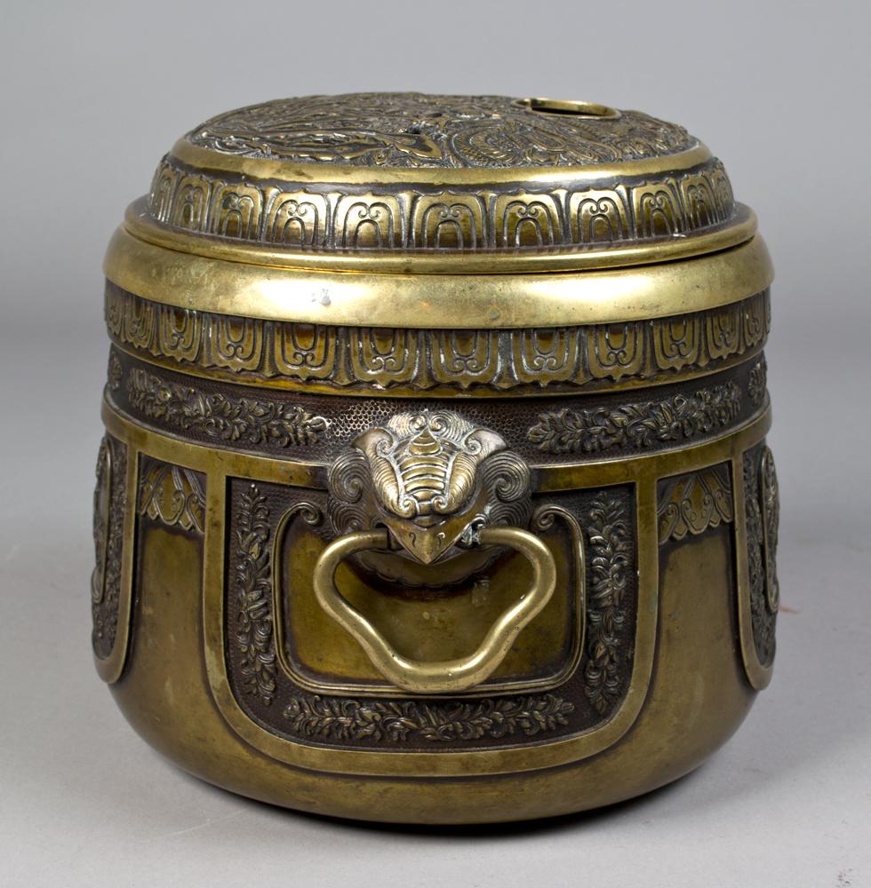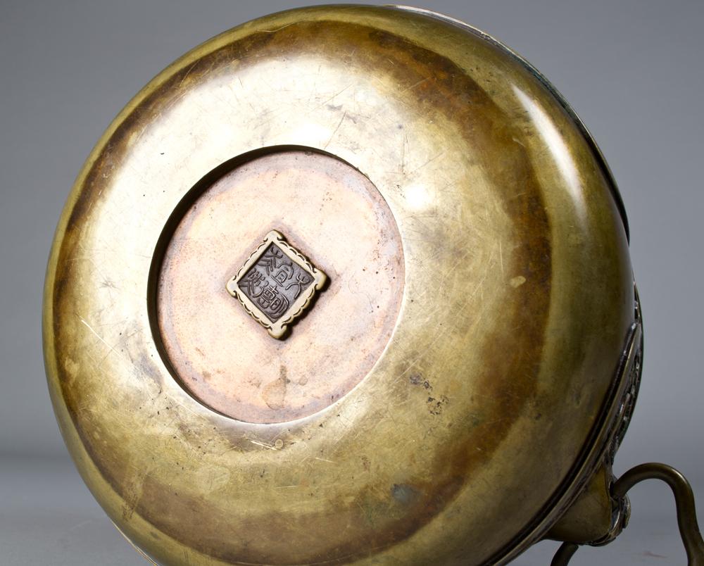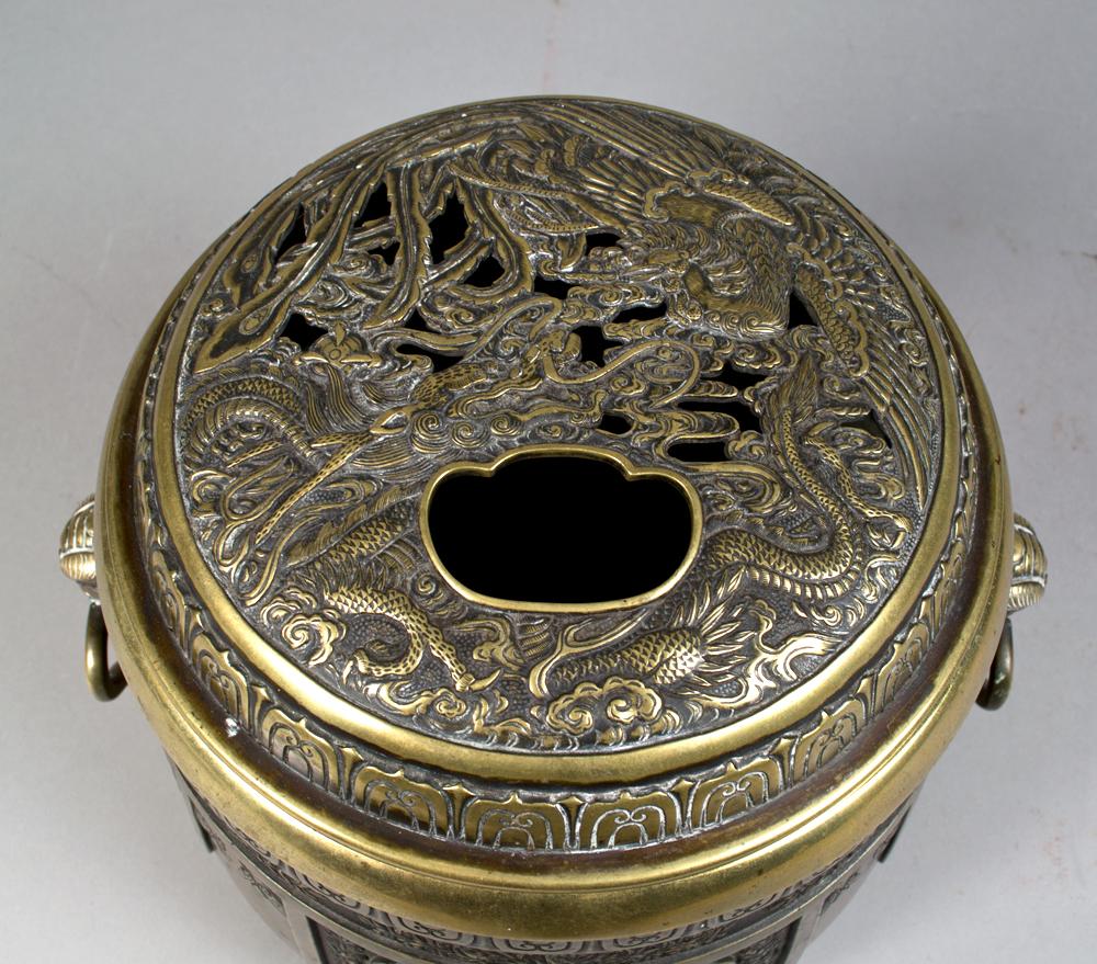 With two phoenix head handles with loose bronze rings the body finely carved with armored dragons in various poses the lid finely worked with phoenix and a five clawed dragons chasing a flaming pearl amongst ruyi clouds, the recessed base with six character mark probably Ming mark within a framed bronze border, 9.5"H X 11"W very heavy and very well done circa 18th or 19th century.