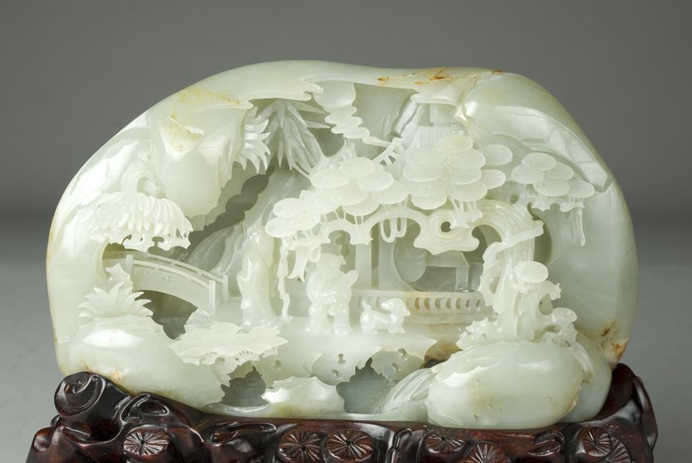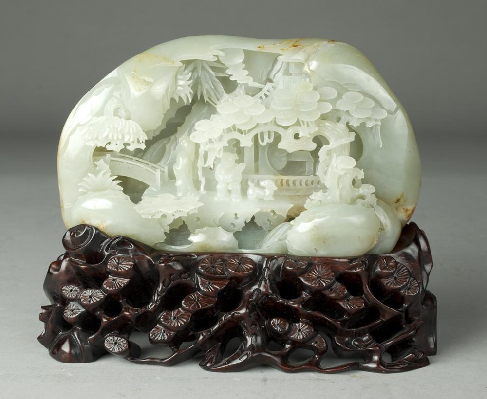 Finely carved boulder of pale celadon hue and exterior skin of mottled russet. Front carved to depict a scene with figures in a building, near a bridge and under a large tree. Back carved to depict the back of the building where the figures are. Carved wooden open base with large tree spreading throughout. 4.5" H x 6.75" W (boulder). Late 19th/Early 20th Century.