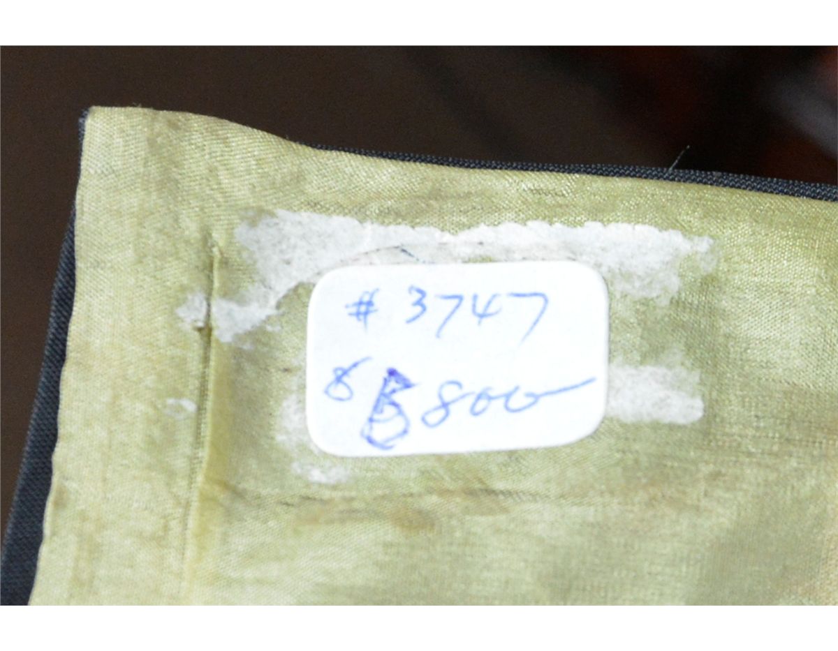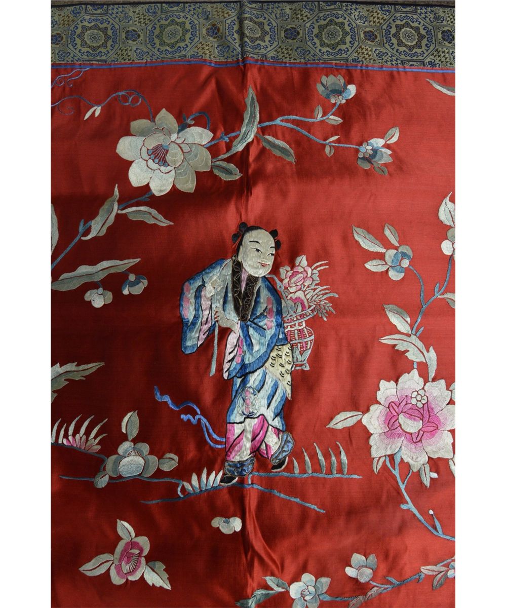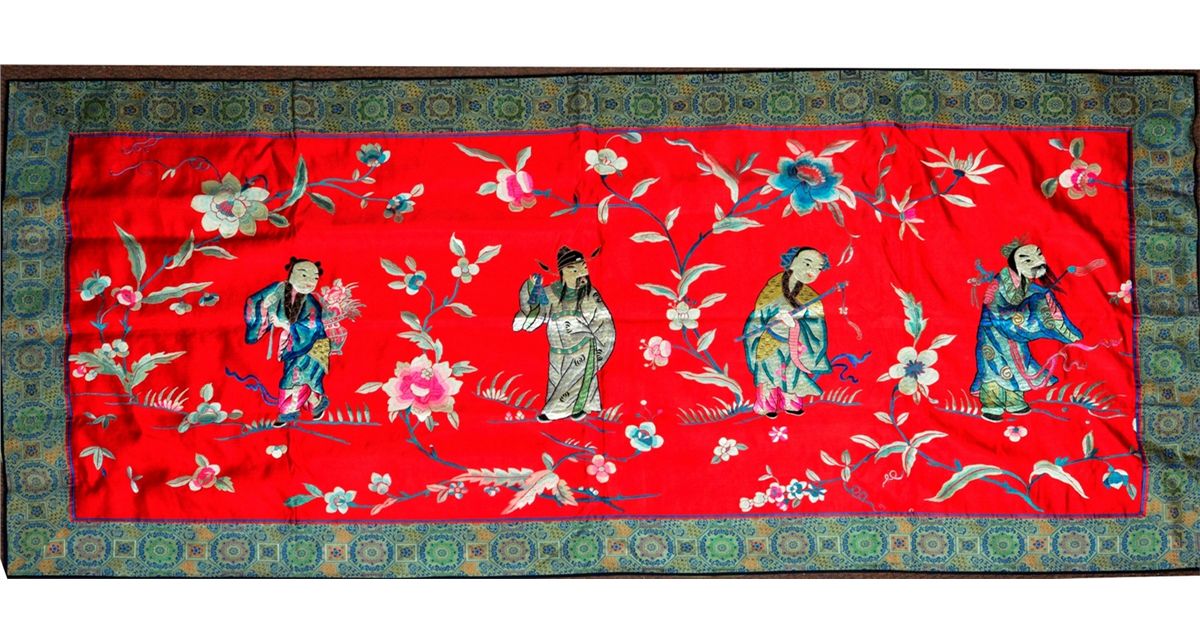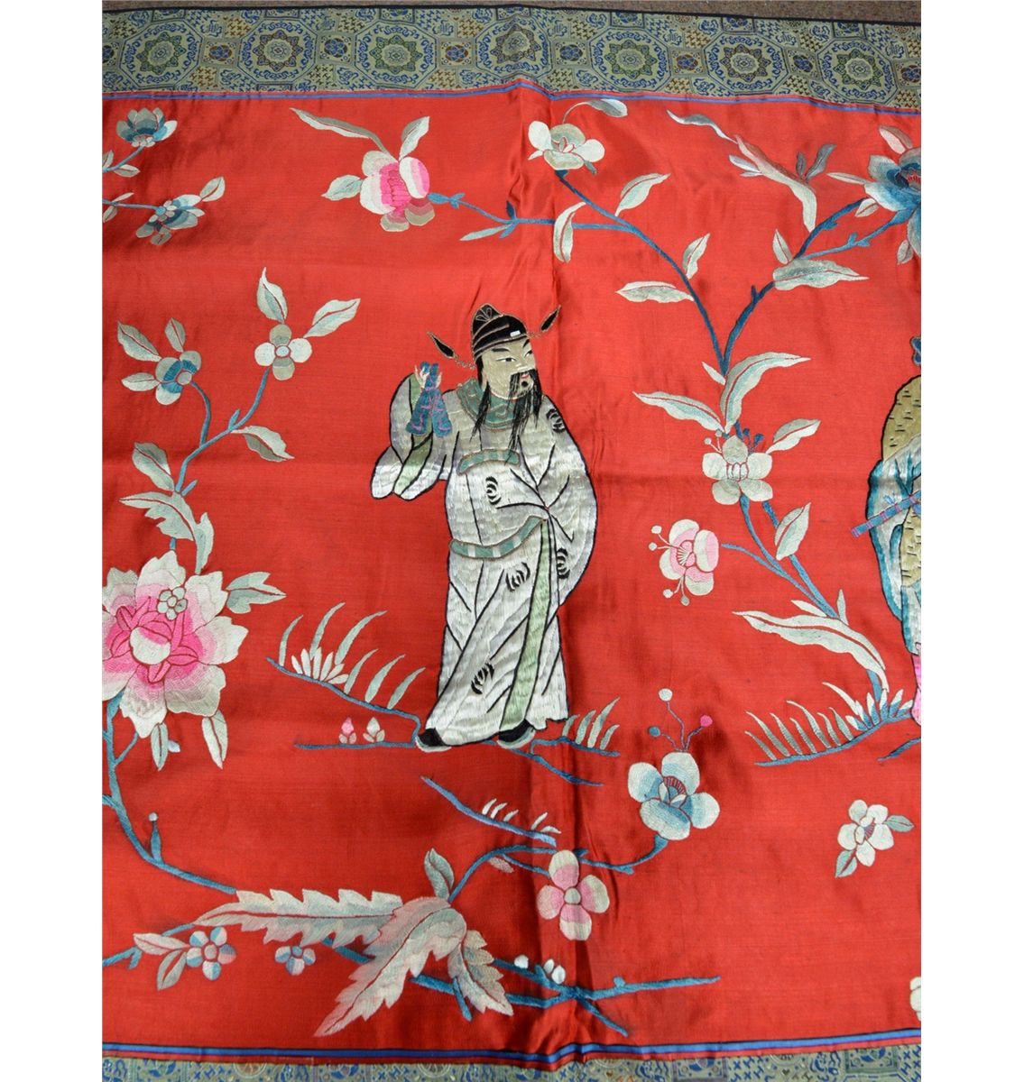Chinese silk textile with embroidered characters and flowers; old price tag of $3800; 77 cm x 165; Provenance: Tuck Shing Antiques Ltd Hong Kong 1989
