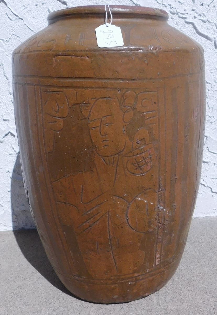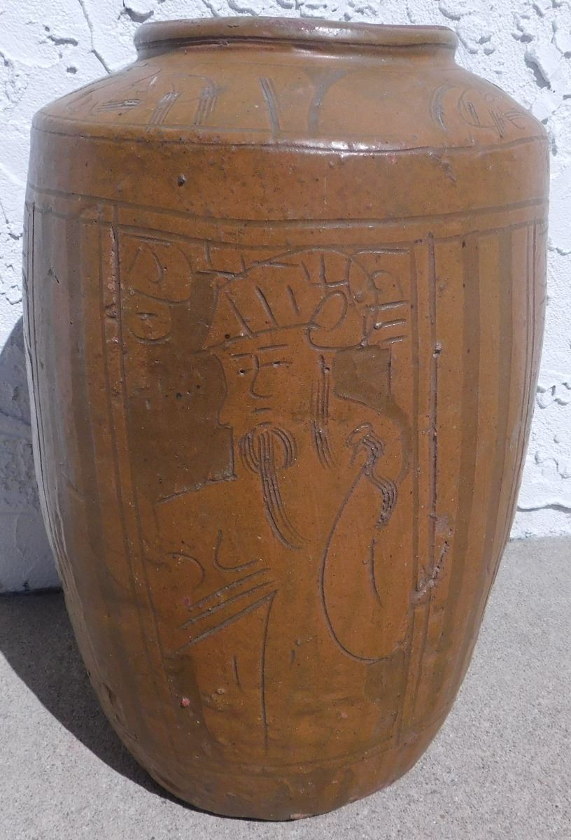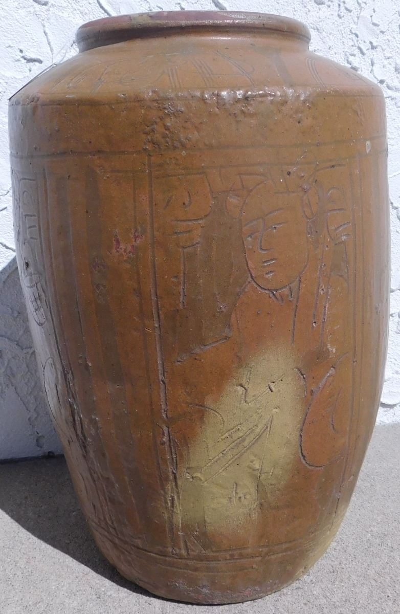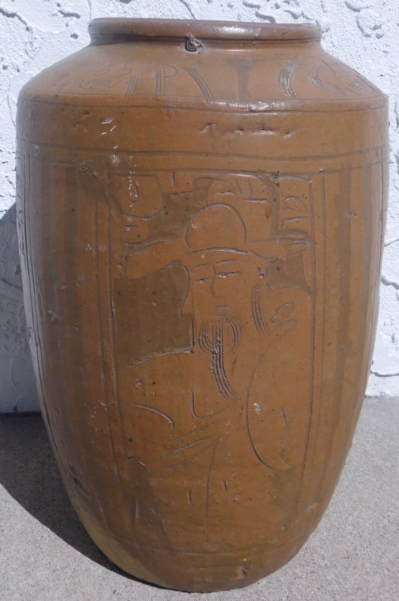 Large Chinese Wine Jar, circa 1850s. Made of clay, this item measures 16.5" x 10". From Southern China. Has four figures carved on sides of jar. Condition: Good, see images. Shipping: $60.00 w/insurance, USA estimate only.