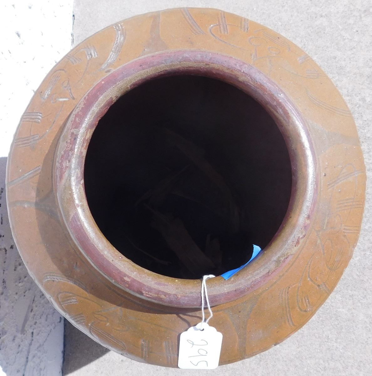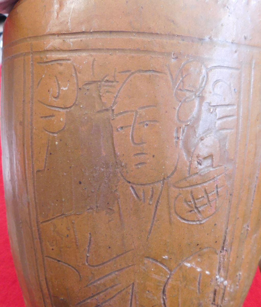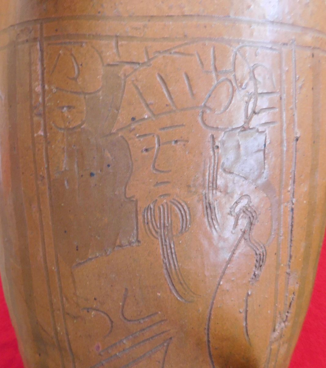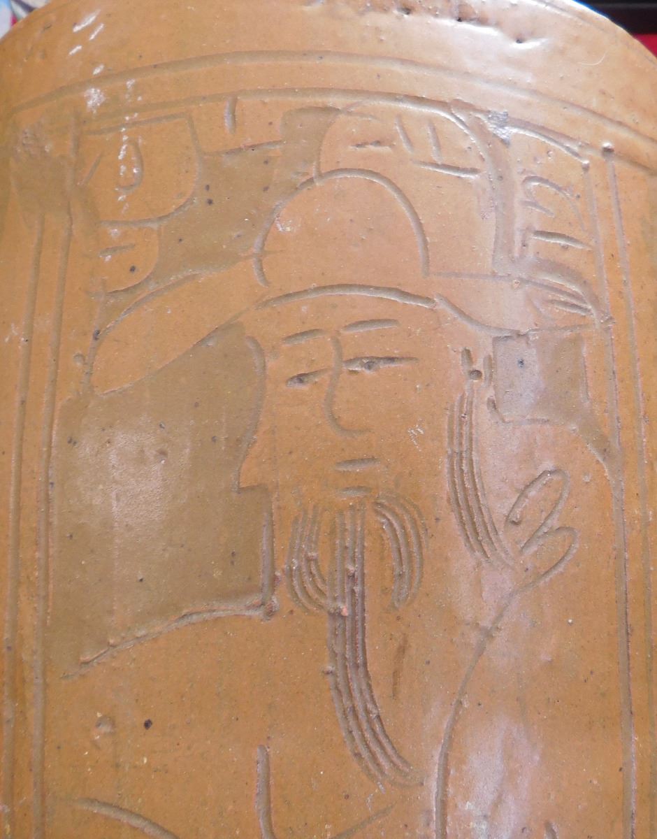 Large Chinese Wine Jar, circa 1850s. Made of clay, this item measures 16.5" x 10". From Southern China. Has four figures carved on sides of jar. Condition: Good, see images. Shipping: $60.00 w/insurance, USA estimate only.