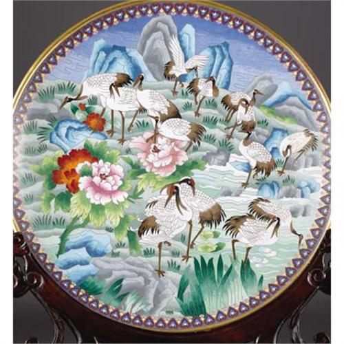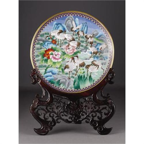 <B>A Large Chinese Cloisonne Enamel Charger on Stand</B></I><BR>Unknown maker<BR>Twentieth Century<BR>Enamel on brass<BR>Unmarked <BR>25.5 inch diameter<BR> <BR>Decorated with cranes within a landscape.<BR><BR><b>Shipping:</b> Miscellaneous Collectibles, Larg (<a target="_blank" href="http://www.heritageauctions.com/common/shipping.php">view shipping information</a>)