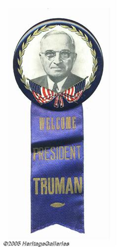 <B>Large, Choice Harry Truman Badge with Ribbon</B></I> "Welcome President Truman" states the purple ribbon attached to this superb 3.5" diameter badge with a black and white likeness of Truman above crossed red, white and blue flags and surrounded by a laurel wreath against a dark blue background. Union printed, cardboard backed, manufactured by the esteemed Philadelphia Badge Company and distributed by the Eagle Regalia Company of New York. Rarely seen this nice. Lot:263